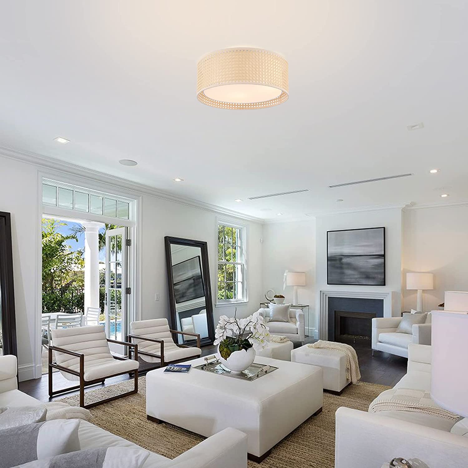 WINGBO 15.7" Modern 3-Light Flush Mount Ceiling Light Fixture with Rattan & Fabric Double Drum Shade for Bedroom Living Room Dining Room Hallway Entryway, Khaki