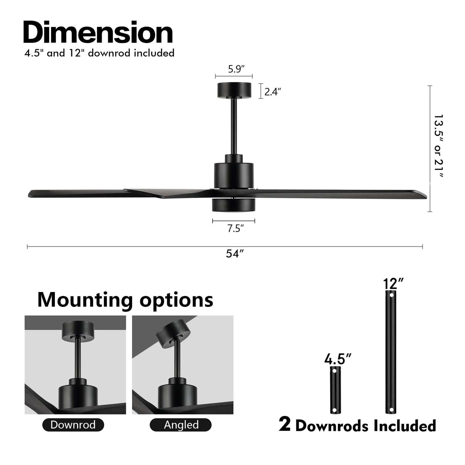 - MADE FOR ANY SPACE: The 54-inch blade span makes this ceiling fan perfect for spaces like living rooms, bedrooms or larger rooms (suitable for damp places). 2 down rods (4.5” and 12” long) are included to match different ceiling heights.