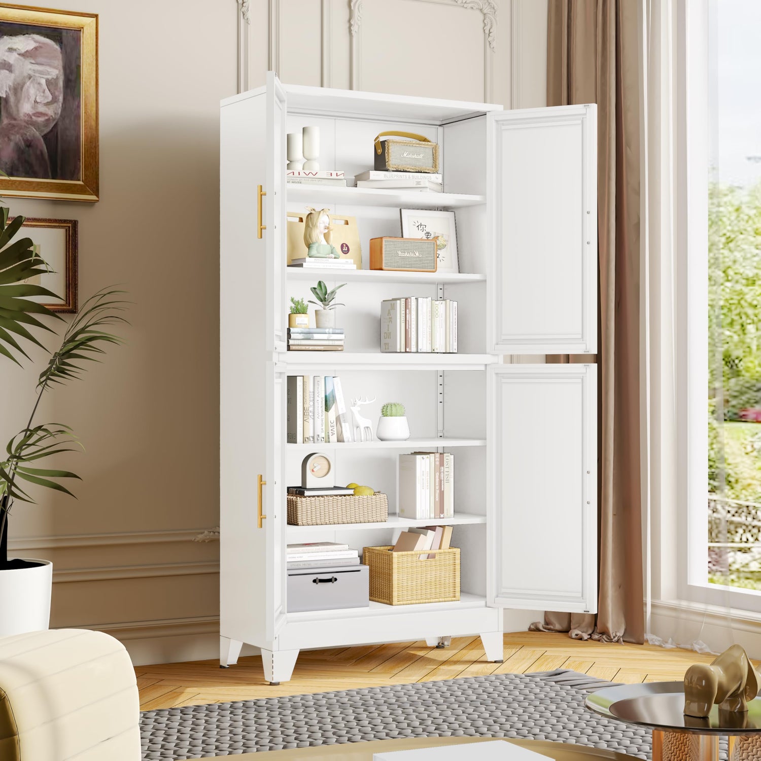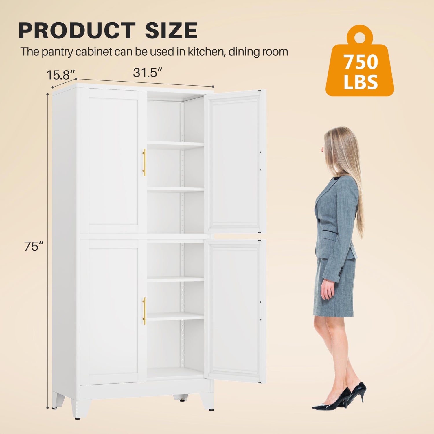 winiowa 75" Tall Kitchen Pantry Cabinet, Metal Storage Cabinet with Doors and Adjustable Shelves, White Freestanding Pantry Cabinet for Kitchen, Dining Room, Living Room, Laundry Room, Bathroom