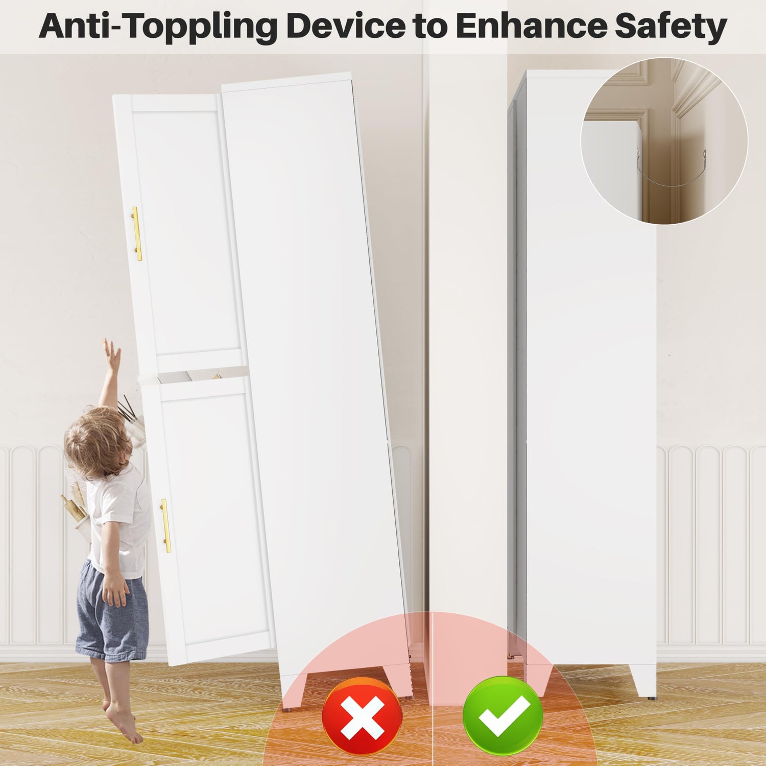 - 【Dimensions & Sturdy Construction】:The white kitchen storage cabinet measures 15.75"D x 31.5"W x 75.2"H. The food pantry cabinet includes 4 adjustable leveling feet for added stability and weight-bearing capacity. It can be equipped with a wall anchor kit and can be more securely fixed to the wall. Prevent steel pantries from tipping and create a safer living environment
