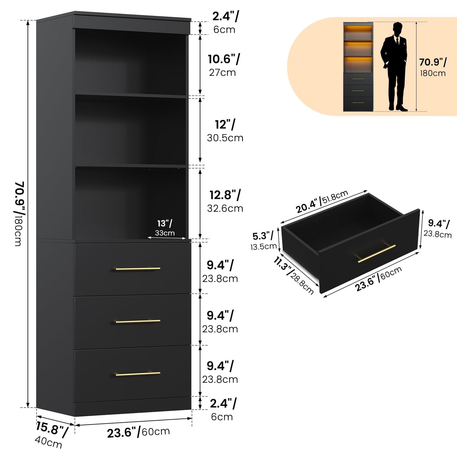 Winkalon 71“H Black Bookshelf with LED Light, Bookcase and Bookshelf with Drawers, Tall Bookcase Tall Storage Cabinet 3-Tier Open Shelves for Home Office Living Room Bedroom