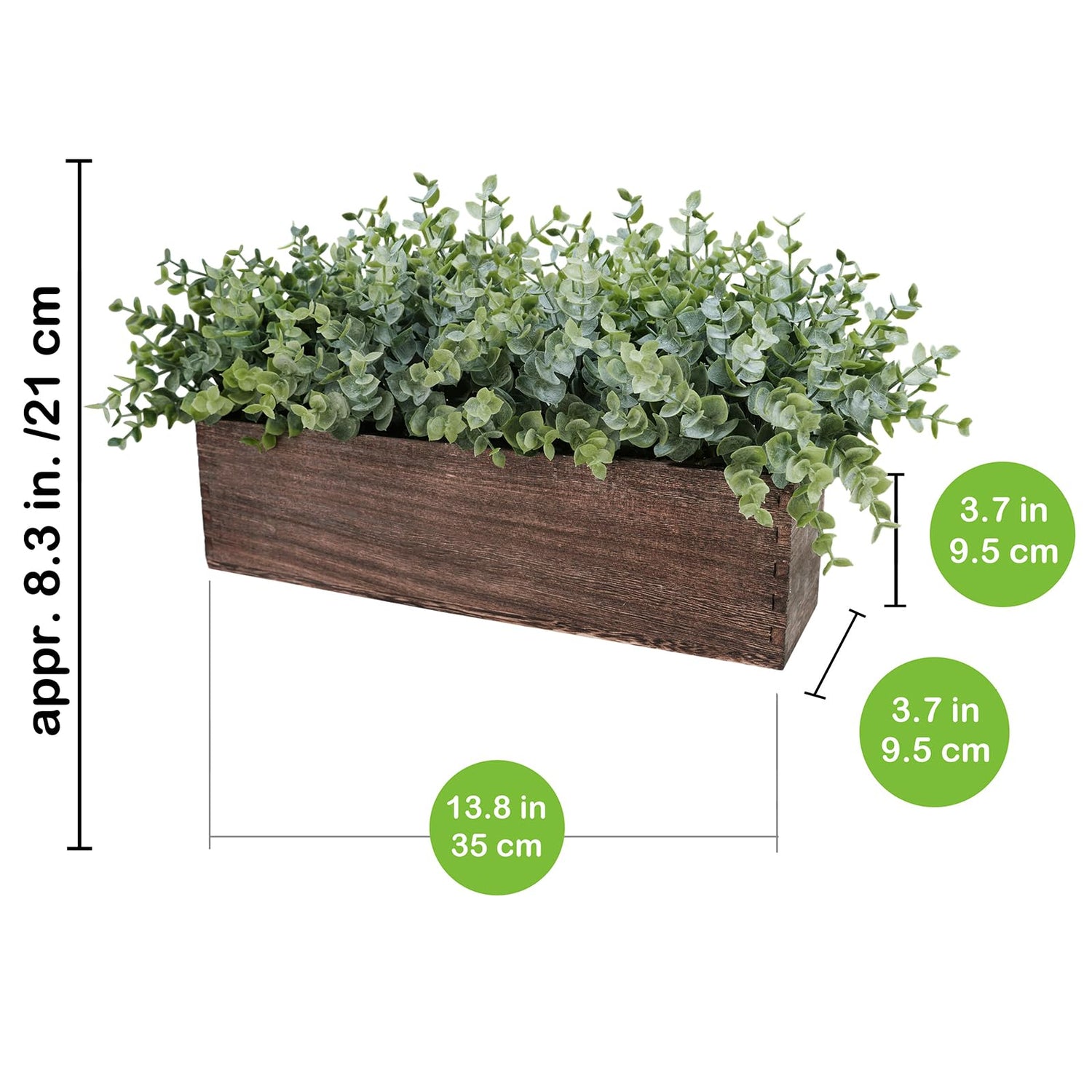 - Vibrant Color: Artificial eucalyptus plants are in a two-tone green color with bushy, attractive foliage. The subtle dusty finish enhances their realism. The rectangular wood planter box is in a deep brown color, topped with tiny pebbles for a more authentic look. The striking contrast between the vibrant green of the eucalyptus and the rustic charm of the wood planter is a feast for the eyes.