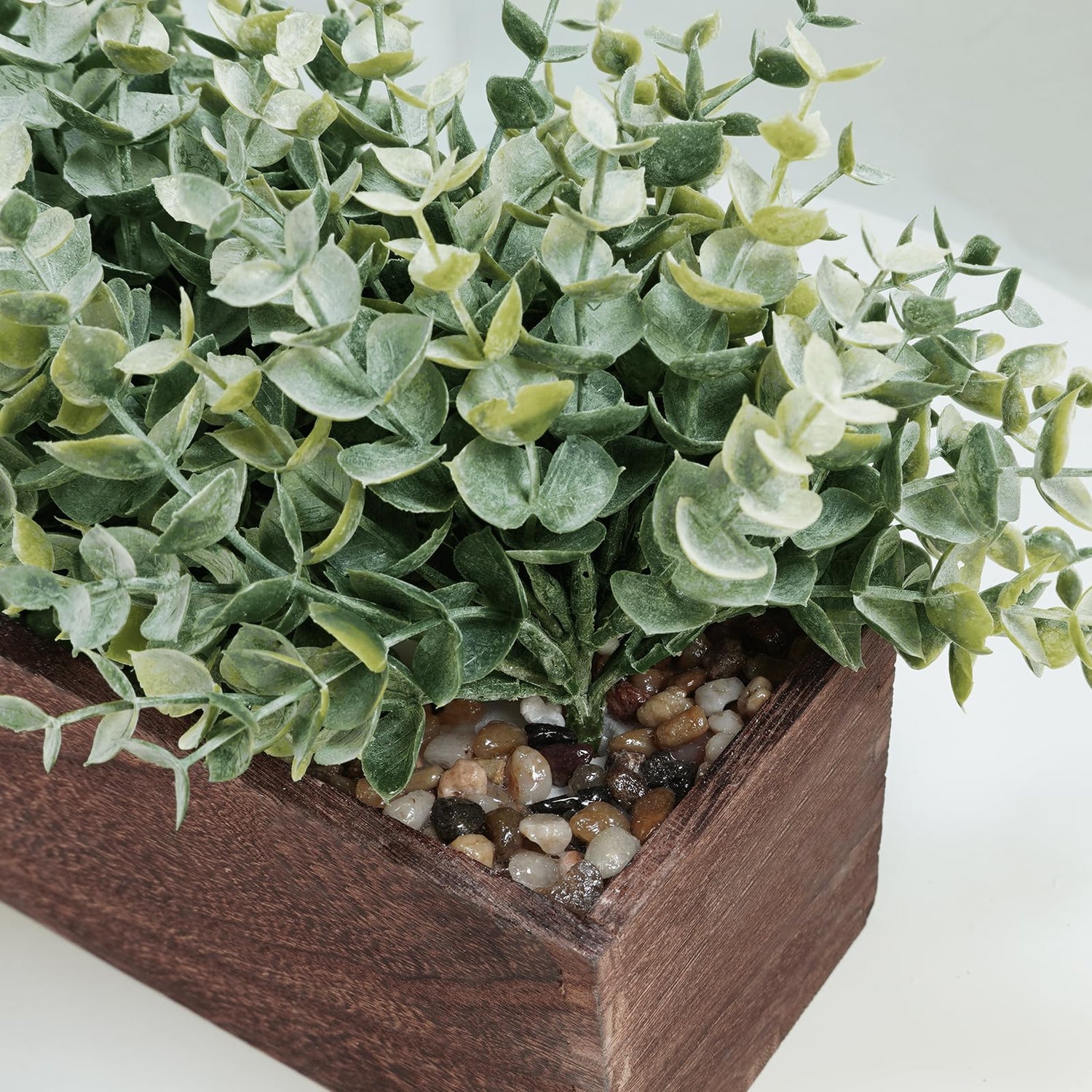 - Elevate your space with the timeless beauty of this faux eucalyptus plants with rustic wooden box. Perfect for home, office, apartment, or event spaces, this greenery arrangement brings a touch of nature indoors. Whether you're dressing up a counter, brightening a windowsill, or creating a focal point on a dining table, sofa tables, mantel shelf, or cabinets, it's a great choice. Suitable for your kitchen, living rooms, bathrooms, and bedrooms, making it a year-round decorative staple.