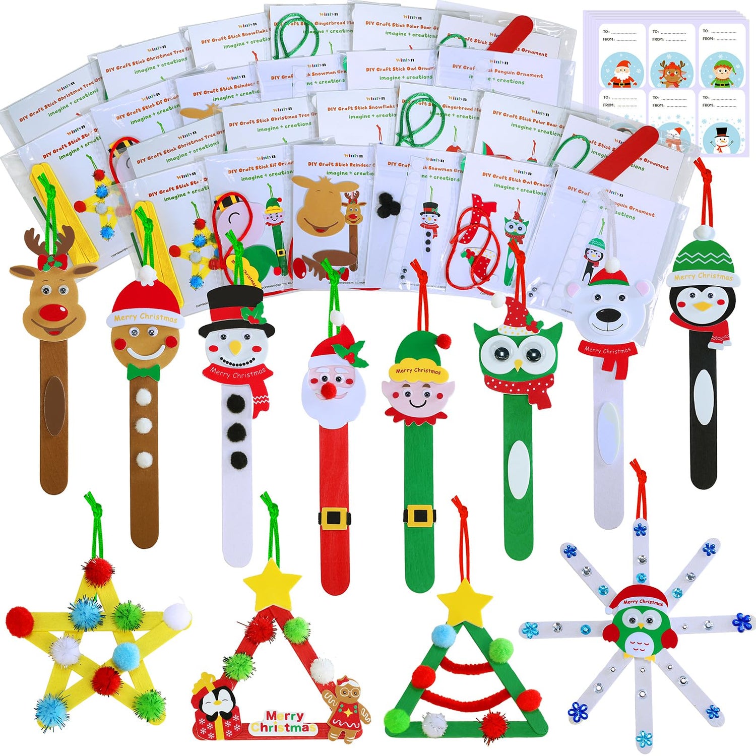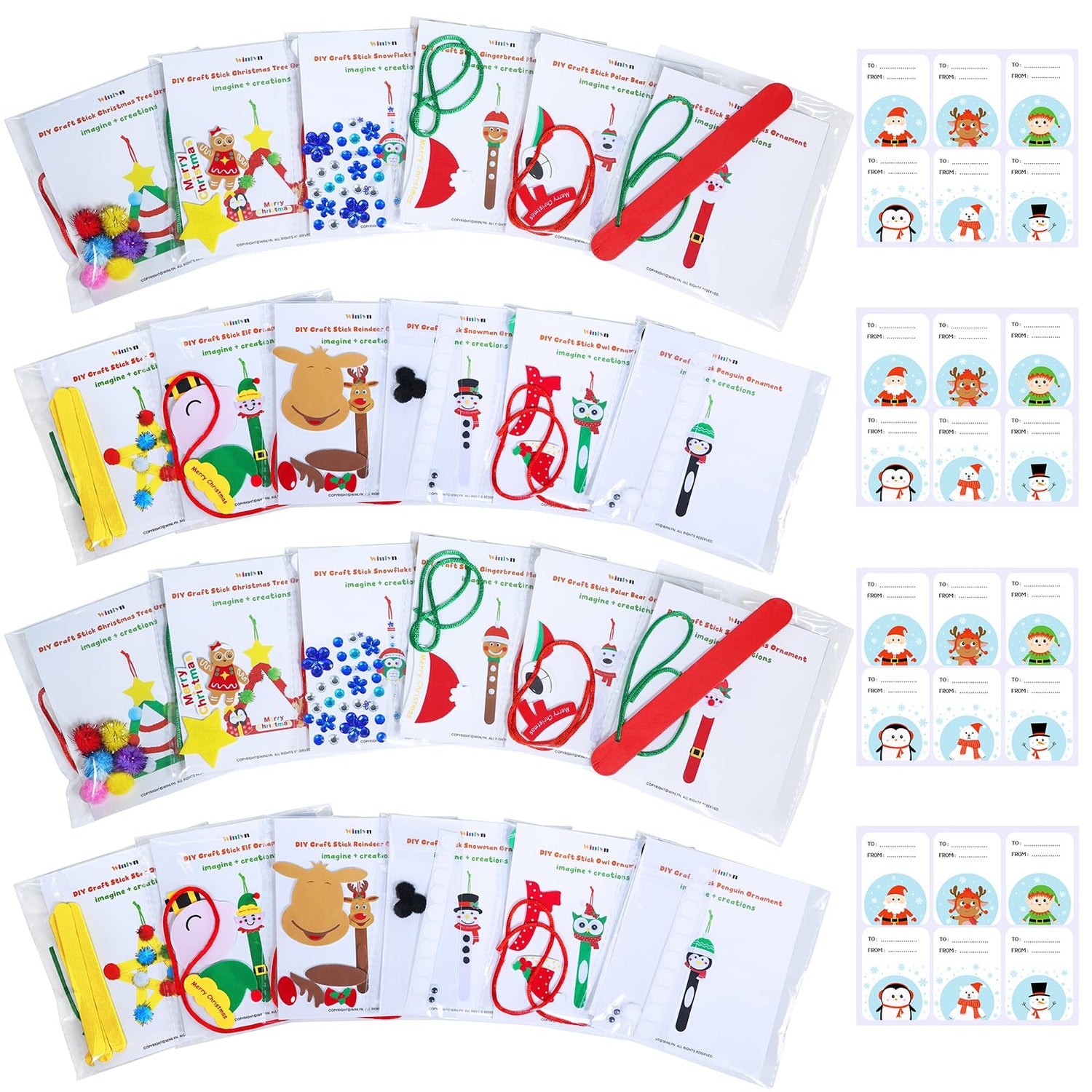 - 24 Xmas Craft Kits: Each of our 24 popsicle stick Christmas ornament making kits comes individually wrapped, featuring 12 different popsicle stick Christmas ornaments designs- reindeer, gingerbread man, snowman, Santa Claus, elf, owl, polar bear, penguin, star, XMAS tree and snowflake. Included in each kit are assorted popsicle sticks, foam Christmas stickers, pom-poms, chenille stems, jewel stickers, satin cord, adhesive dots, and instructions. Package also contains 24 pcs gift stickers.