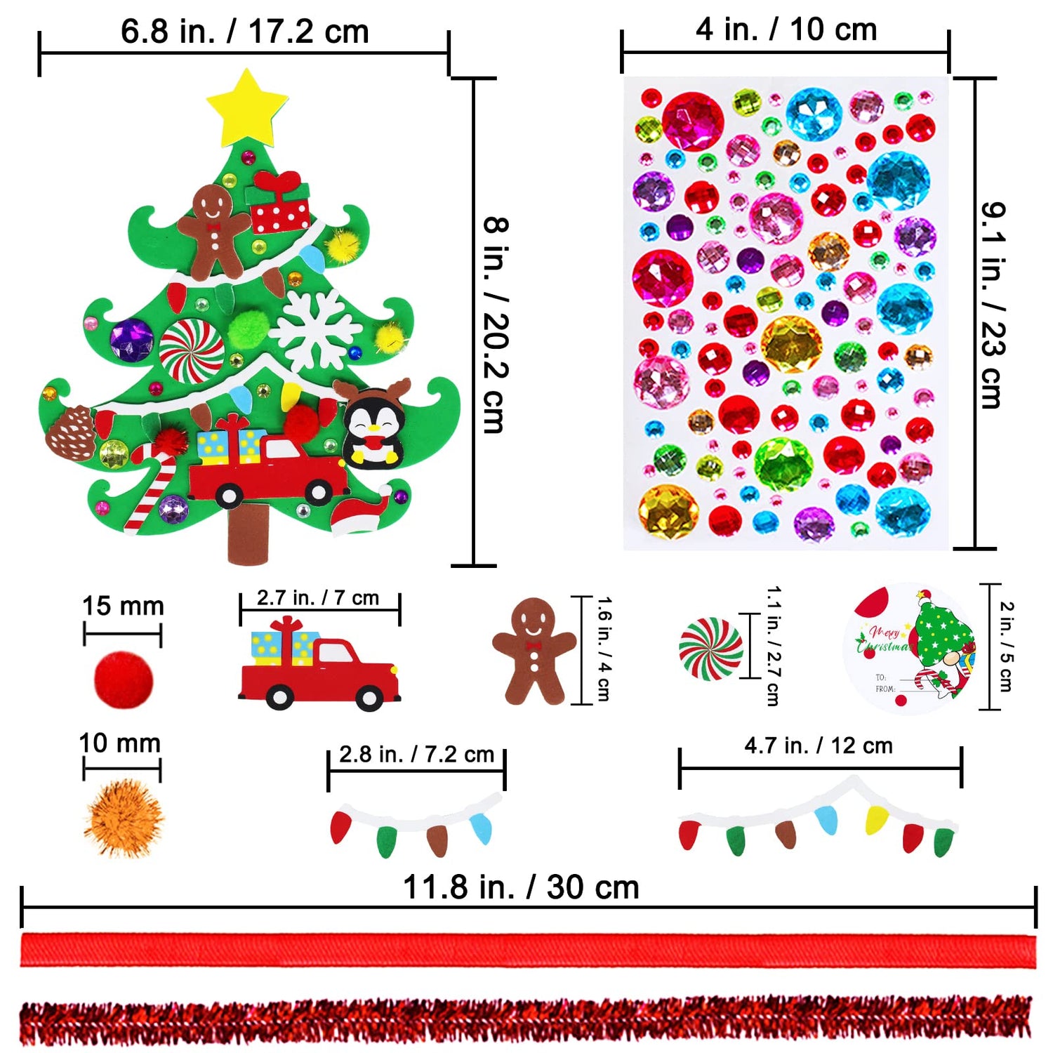 - Size: Christmas tree shaped foam bases are about 8" tall and 6.8" wide. Christmas prints foam stickers measure about 1.1"-5.5" in diameter depends on the shape. Pom-poms are about 0.4"-0.6" in diameter. Glitter chenille stems are 11.8" long and 0.23" wide. Satin cords are 11.8" long. The Christmas gift sticker is about 2" in diameter. The finished Christmas tree ornaments are ideal for hanging on the Christmas tree, windows, wall, door, or mantel.