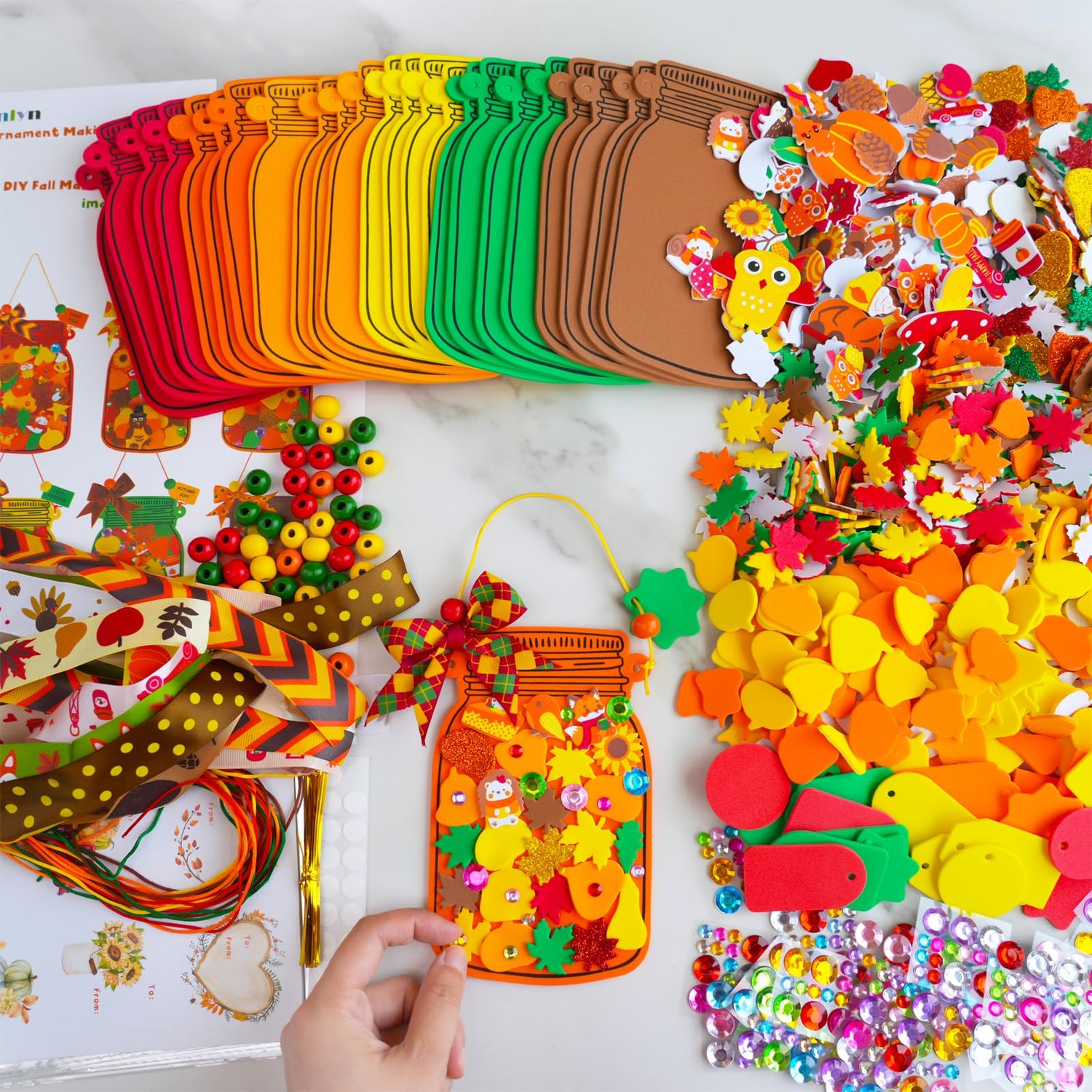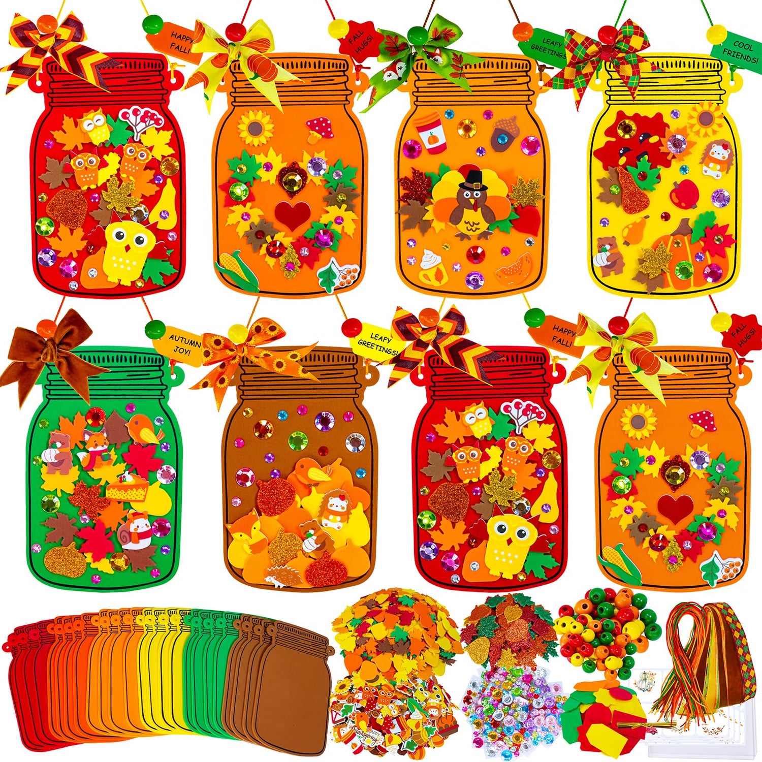 • 24 Fall Leaf Pumpkin Mason Jar Ornament Craft Kits: This fall craft kit includes materials for 24 mason jar ornament sets, perfect for kids' crafts, Thanksgiving classroom activities, autumn parties. Set includes 24 mason jar-shaped foam bases, 408 fall leaf and pumpkin stickers, 72 glitter foam stickers, 138 fall-themed stickers, 24 jewel sticker sheets, 48 beads, 40 adhesive dots, 24 cords for bows, 24 hanging cords, 24 gift tags, 24 treat bags, 24 twist ties, 24 gift stickers and 2 guides.