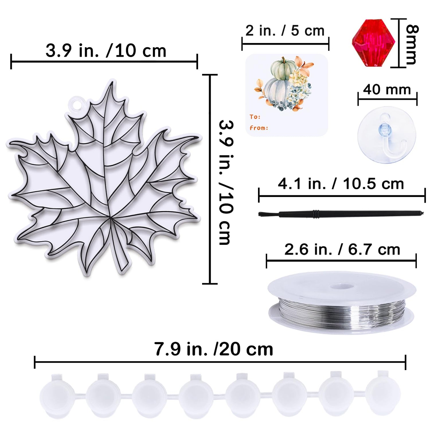 - Size: These transparent fall leaf suncatchers are about 4" in diameter. Each bottle of suncatcher paint holds 0.2 fl oz (6ml), and each mini empty paint pot holds 0.06 fl oz (2ml). The acrylic beads measure about 0.3" in diameter, and the fishing thread is approximately 393.7" long. Each suction hook is about 2.4" in diameter. The sizes are perfect for little hands! Once completed, the autumn window hanging suncatcher ornaments are perfect for glass windows, doors, porches, or gardens.
