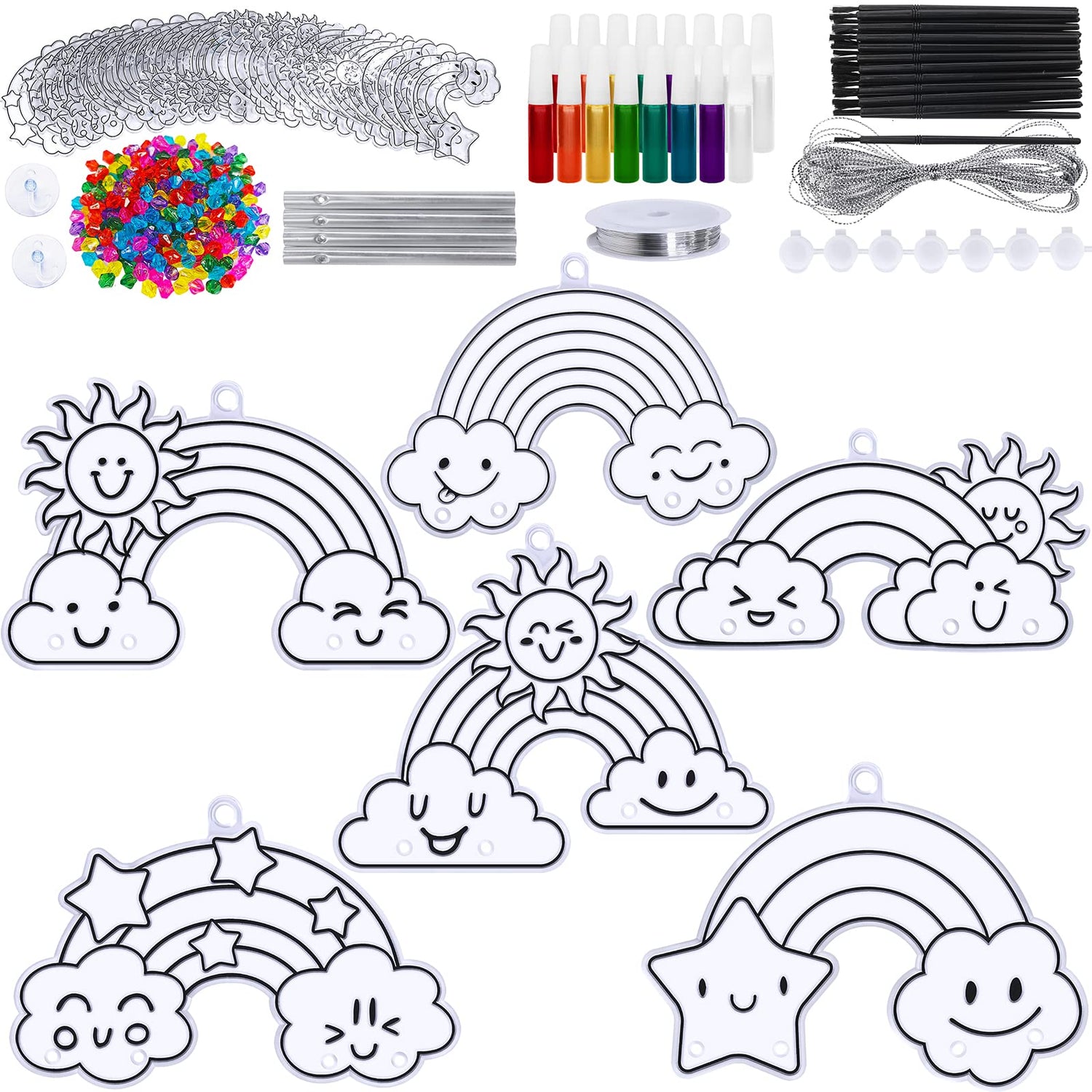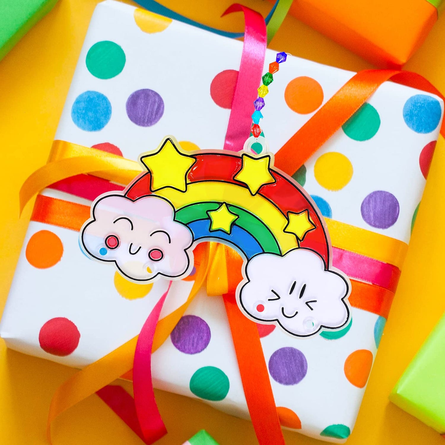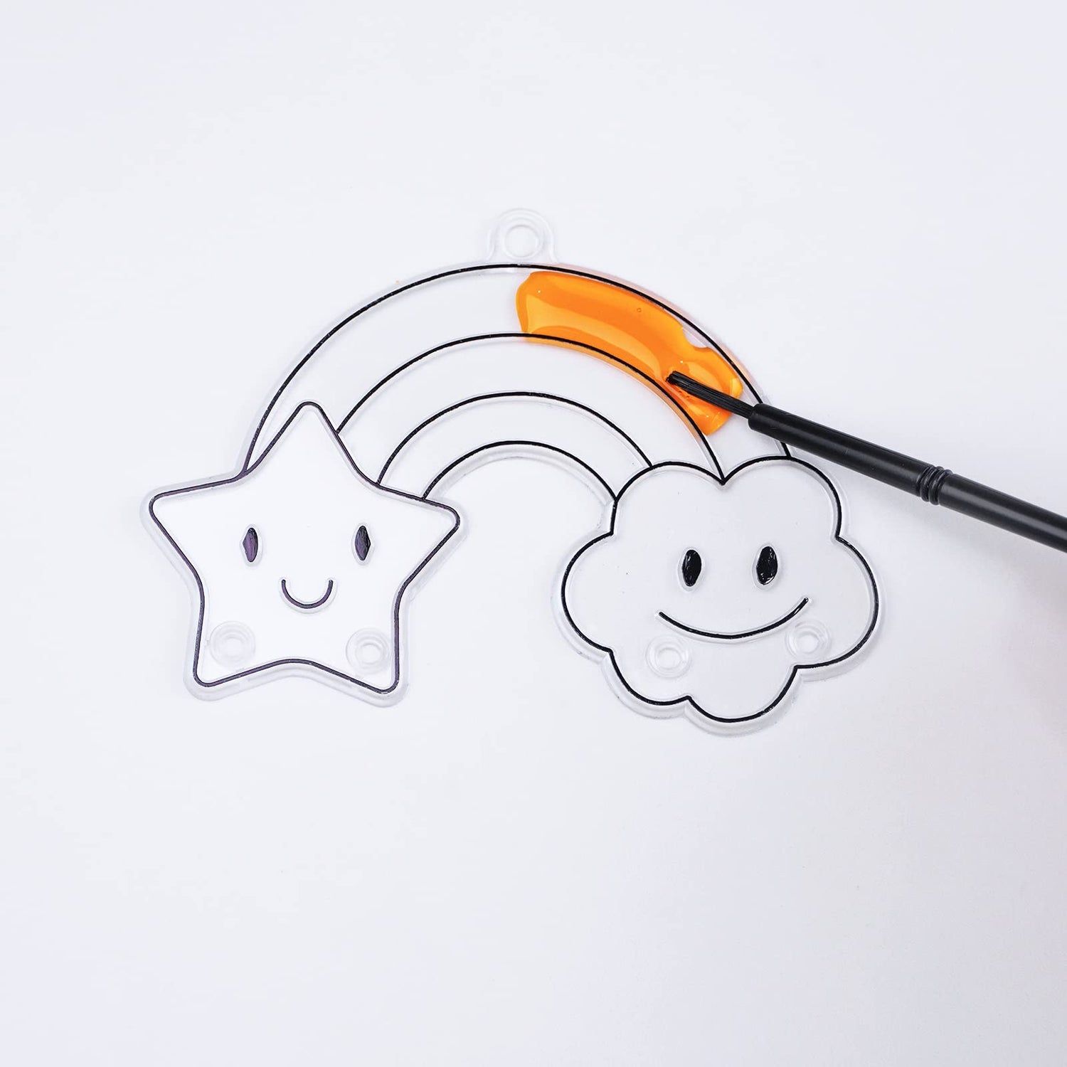 - Color: These transparent rainbow window suncatchers are shaped like a rainbow arching between two cute clouds and accented with a smiling sun or stars. The surface has pre-cut lines, so you can easily add different colors to the suncatchers. Suncatcher paints have 8 colors including red, orange, yellow, green, turquoise, blue, purple, and white. These translucent paints will recreate the classic colors of the rainbow arch as the sunlight shining through. Acrylic beads are in rainbow colors.
