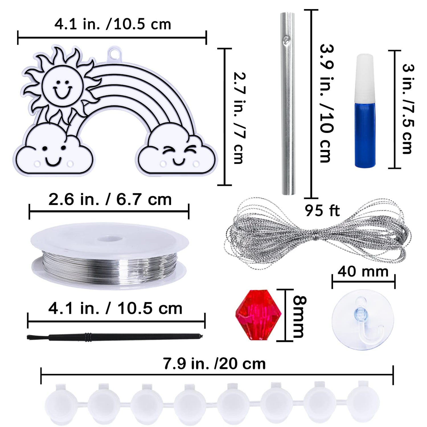 - Size: Rainbow sun catchers are about 4.1" wide and 2.7" tall. Each bottle of suncatcher paint is 0.2 fl oz/6ml in capacity. Each mini empty paint pot holds 0.06 fl oz /2ml of paint. Acrylic beads are about 0.3" in diameter. Each metal wind chime tube is about 3.9" L. The silver thread is about 95 ft long. The fishing thread is 393" L. Each suction hook is about 2.3" in diameter. The assembled rainbow window art decorations are perfect for hanging in the windows, glass door, garden, porch.