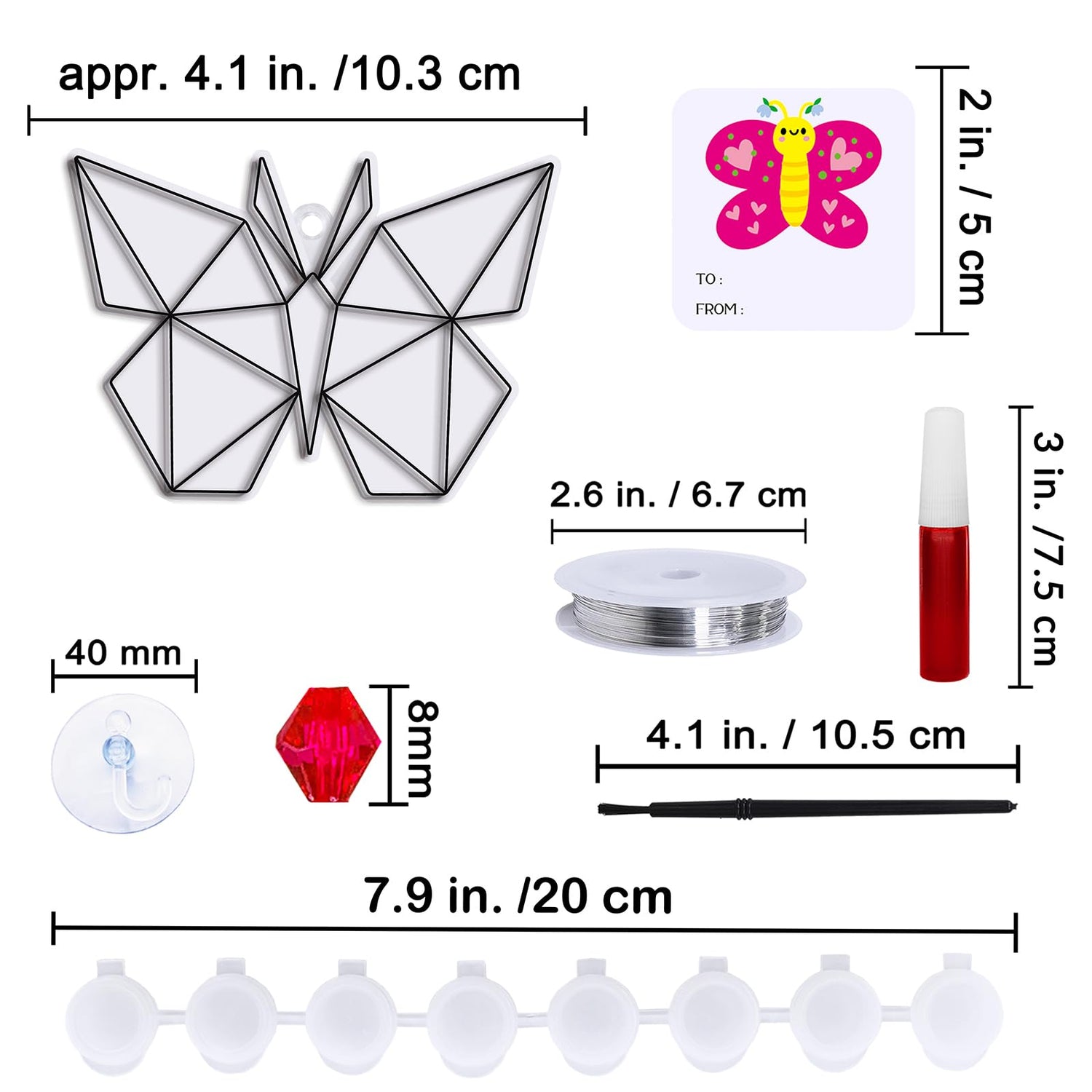 - Quantity: 27 sets butterfly suncatchers DIY window paint art suncatchers craft kits include 27 pcs butterfly sun catchers in 9 designs, each design has 3 pcs. 20 pcs bottles of 10 rainbow colors suncatcher paints (6ml per bottle), 1 strip of 8 empty paint pots, 27 pcs paintbrushes, 324 pcs rainbow acrylic beads, 1 roll of fishing thread, 27 pcs suction hooks, 1 empty paint bottle. Each suncatcher has a hole at the top for hanging. Perfect for kids and adults.