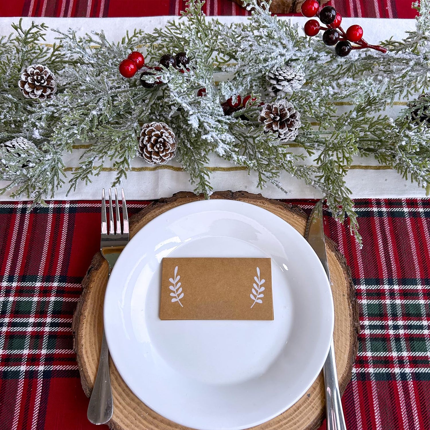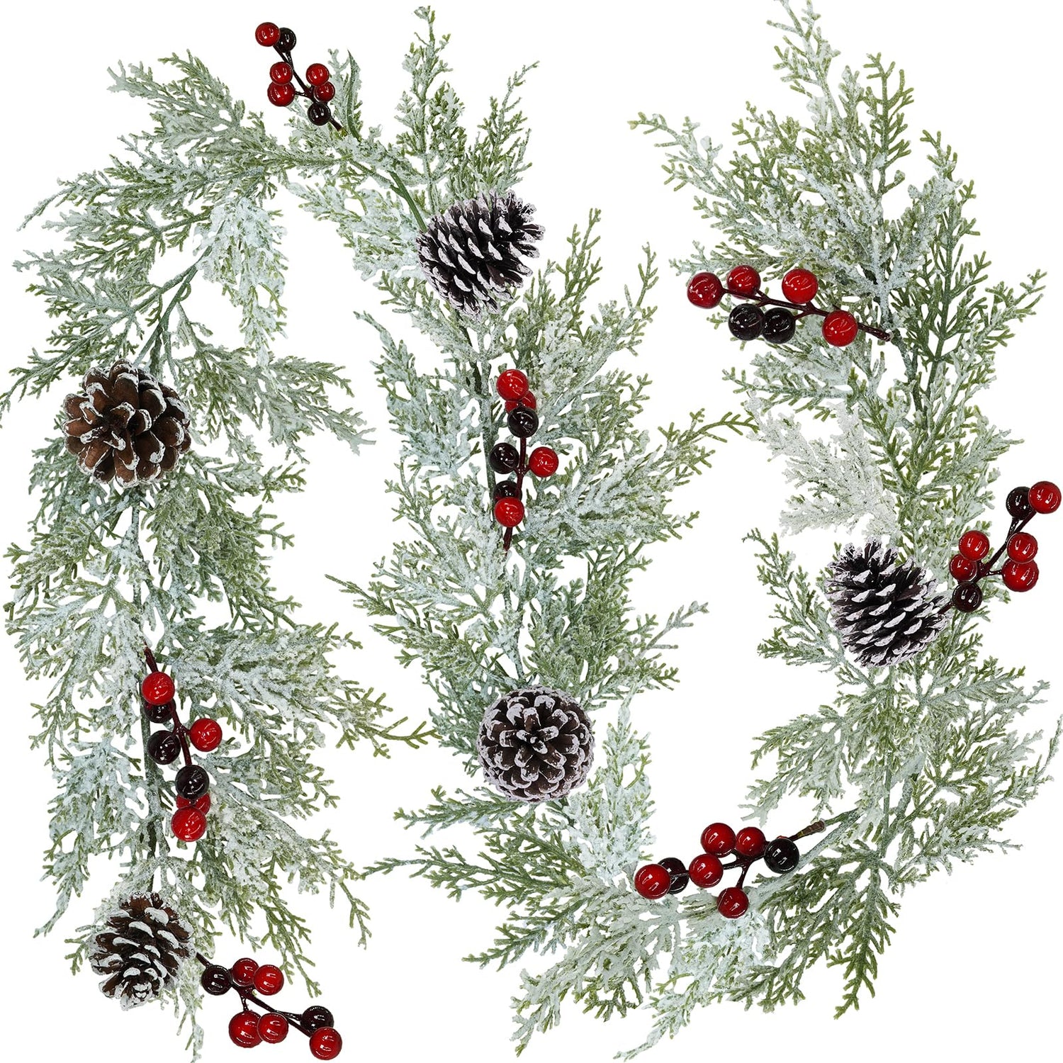 - Quantity: Package includes 1 pc artificial snowy cedar garland Christmas greenery garland. With 5 frosted pine cones, 7 faux red berry clusters and more lush greenery of cedar and pine, this artificial cedar greenery creates a full and gorgeous garland for your winter or Christmas decorations. It is ready to add a farmhouse winter wonderland feel to your holiday home, winter wedding, baby shower, bridal shower, and event decor that is sure to impress everyone.