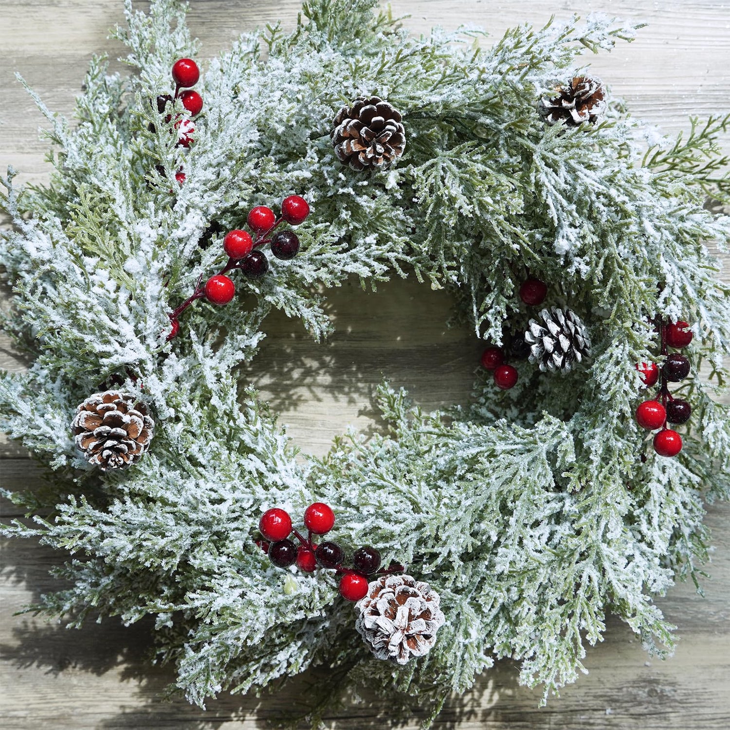 - Color: Faux winter greenery garland features cedar greenery in a soft light green color with a flocked snowy coating for a wintry look. Featuring a mix of Christmas red berries and accented with frosted pine cones, the faux Christmas garland greenery makes a perfect addition to the decor. Include it in your holiday displays for some festive color and texture. This artificial cedar garland has a very natural outdoor look that will create a lush and full Christmas decoration.