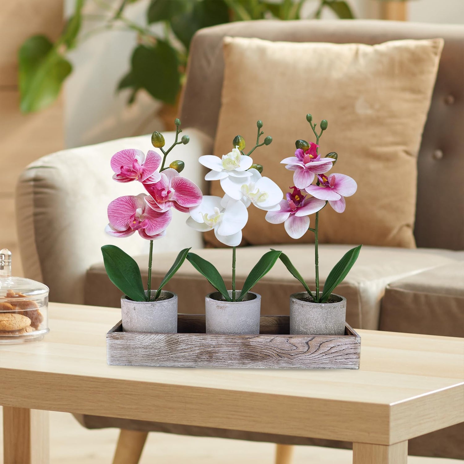 - Add beauty and grace to your home decor with this artificial potted orchid arrangement. You can use them in different areas or keep them together in the wooden planter box. Display them on your office desk, shelf, coffee table, mantel, counter, living room, bedroom, dining room, kitchen, bathroom, and any other place you want to decorate. Plus, they are also great gift for a housewarming, wedding, Christmas, Valentine's Day, Thanksgiving, Mother's Day, birthday ect.