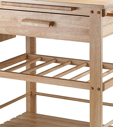 Details: Finland cart provides storage options and a spacious workspace. Hide utensils and cutlery in the deep drawer, keep wine bottle safe on the rack, towels on the hooks, knives safely in the knife block and, store plates and glasses on the bottom shelf.