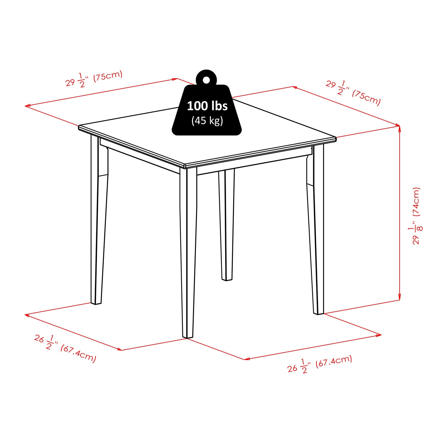 - Overall table size is 29.5" square x 29"H. Floor clearance of 26.3".