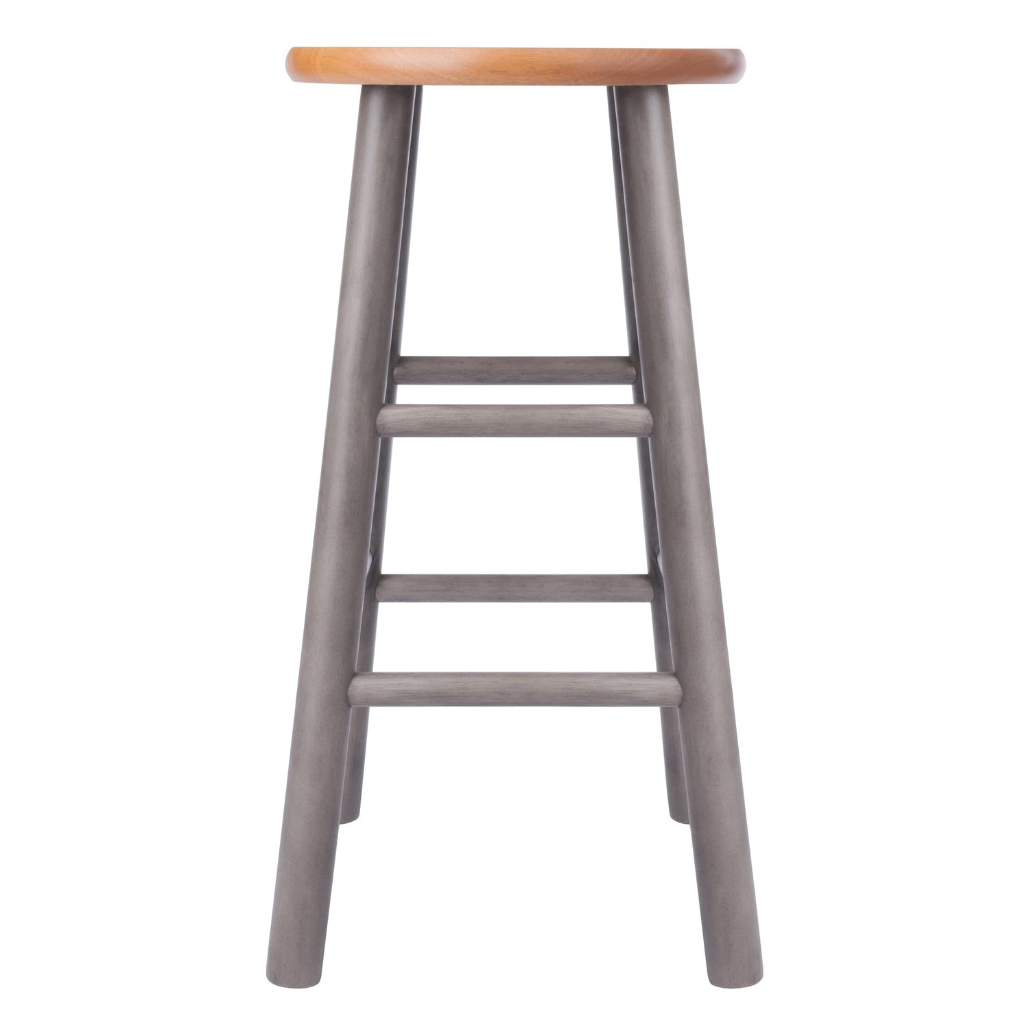 Details: The Winsome Wood 2-piece Huxton Counter Stools will be your go-to seating in the kitchen, family room or dining area. They feature a more conservative foot print than many other flared-leg stools which give them a streamlined, contemporary look and allow them to be tucked neatly underneath a counter or table. Crafted of solid wood, the charming combination of a Teak-finished seat and gray base are a perfect fit with any decor from farmhouse to transitional to modern. Both high and low crossbars on all sides provide stability while also serving as convenient footrests. The round seat is nearly 13" in diameter, providing a generous seating area or an attractive stand for your favorite lamp or plant. The stools are 24.4" high and hold a static weight of 220 lbs. They are also available in a taller bar height. The 2-piece set is conveniently packed and shipped in one box that includes the hardware needed for assembly. Replacement part request can be submitted directly to the manufacturer within 60 days from date of purchase. Overall size: 12.99" x 12.99" x 24.4"H Seat diameter: 12.99" Seat height: 24.4"H Foot print: 12.76"W x 12.76"D Weight capacity 220 lbs. Ships in 1 box Assembly is required