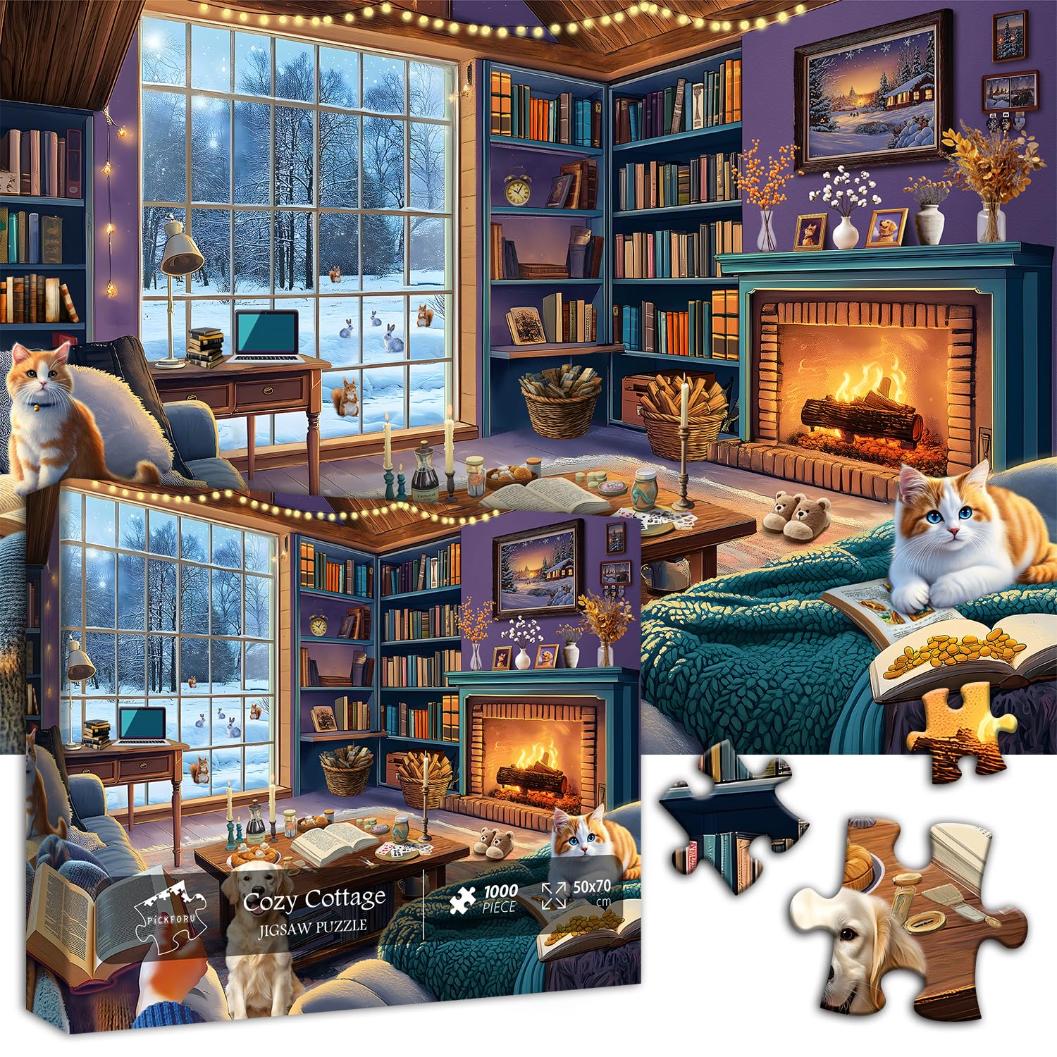 Winter Puzzles for Adults 1000 Piece, Cozy Cabin Puzzle Dog Cat Book Jigsaw Puzzle, Winter Cabin Puzzle Kittens