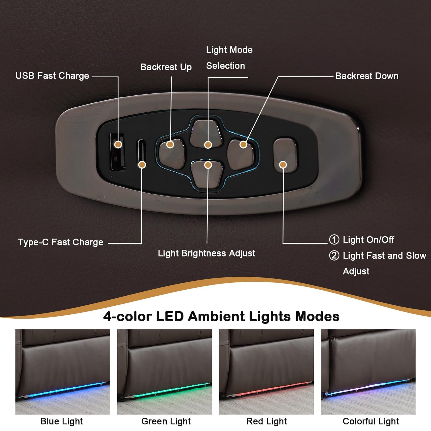 - Ultimate Home Theater Experience: Transform your living room into a captivating home theater with our leather loveseat couch recliner chair. Enjoy customizable LED lighting with adjustable brightness levels, a breathing mode, and four distinct light modes to match your mood. The base light bar ensures easy seat location in the dark, making it Top-notch for gaming rooms, bedrooms, or RVs. Experience unparalleled comfort and style with this versatile, multifunctional sofa recliner