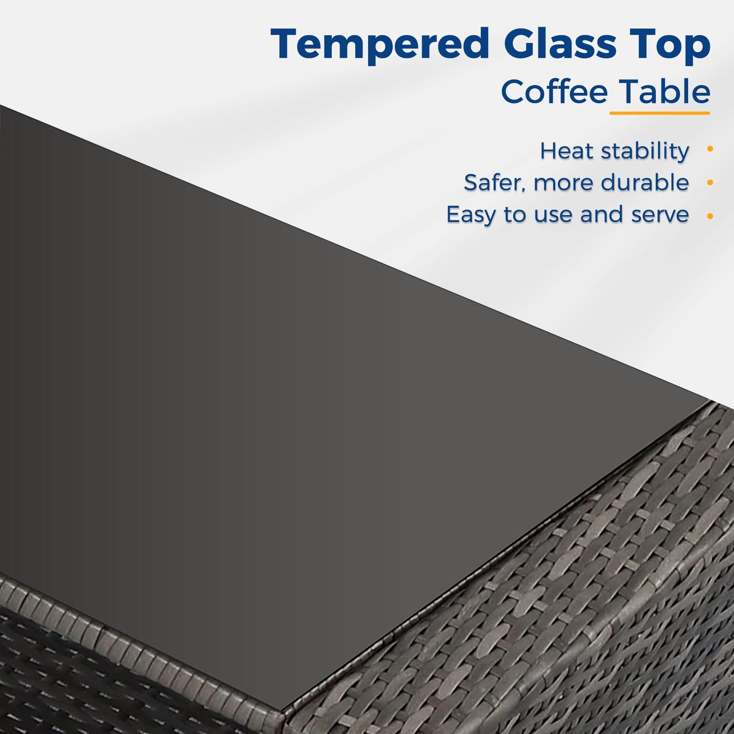 - 【Easy to Maintain】Cleaning and maintaining this patio furniture set is a breeze. The cushion covers can be easily removed with the zipper design, allowing for convenient cleaning. The splash-proof material ensures hassle-free maintenance. Additionally, the tempered glass top of the coffee table can be cleaned by simply soaking a towel in fresh water. For tough stains, soak the towel in water at 100°F for effective cleaning.