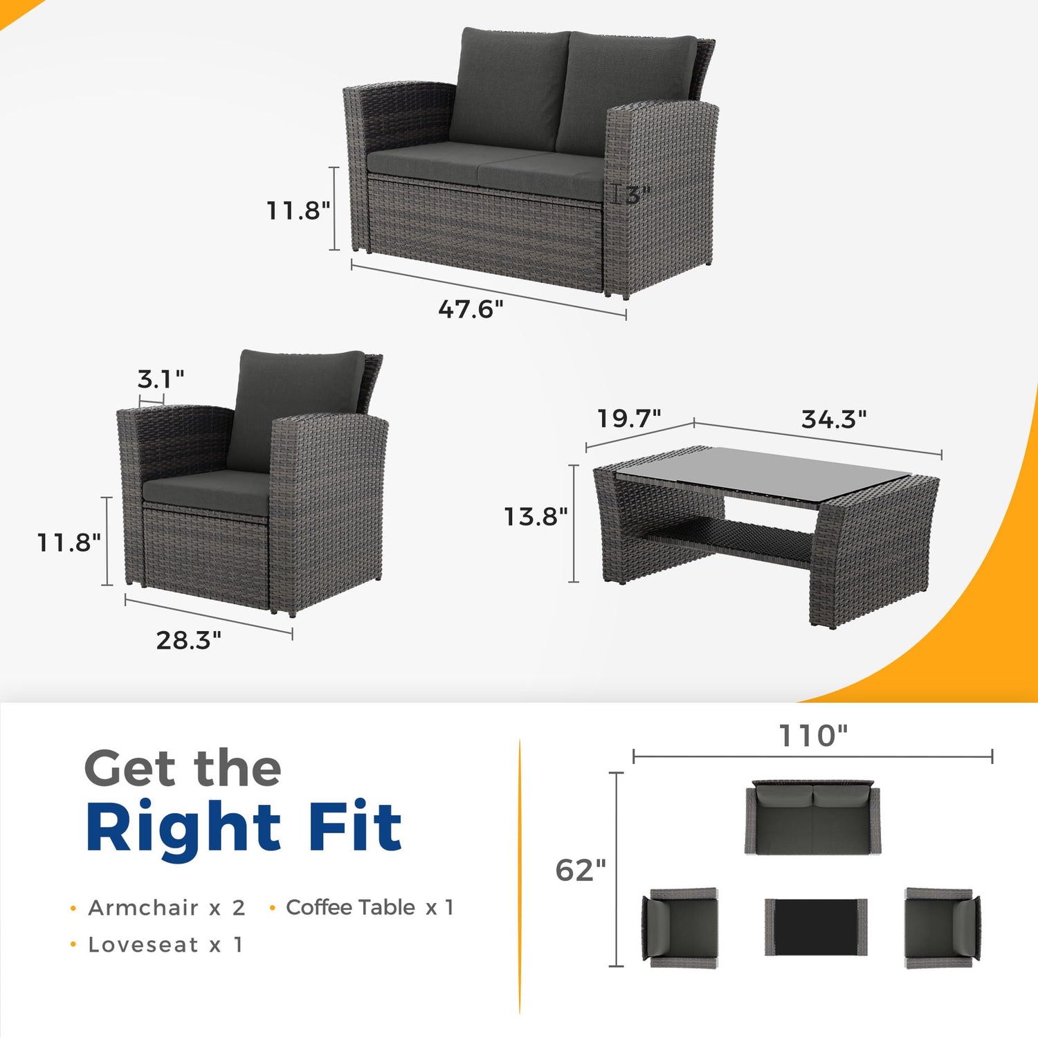 Wisteria Lane 4 Piece Outdoor Patio Furniture Sets, Wicker Conversation Set for Porch Deck, Grey Rattan Sofa Chair with Cushion (Dark Grey
