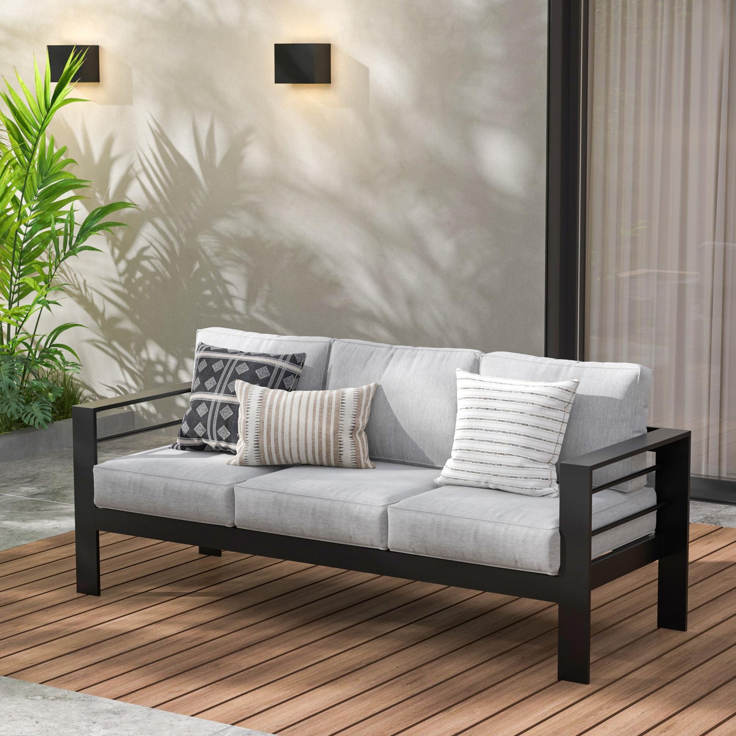 Wisteria Lane Patio Furniture Aluminum Sofa, All-Weather Outdoor 3 Seats Couch, Black Metal Chair with Light Grey Cushions