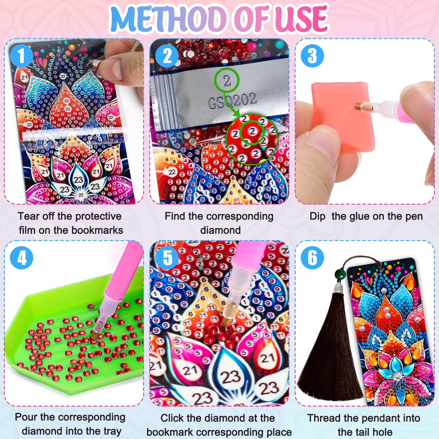 - Effortless Crafting Experience: Pre-Printed Patterns & Step-by-Step Tools .First, tear off the protective film on the bookmark,then pour the corresponding diamond number into the tray, dip the pen on the glue, and stick the corresponding diamond number to the bookmark.Make Creating Stunning Bookmarks Simple