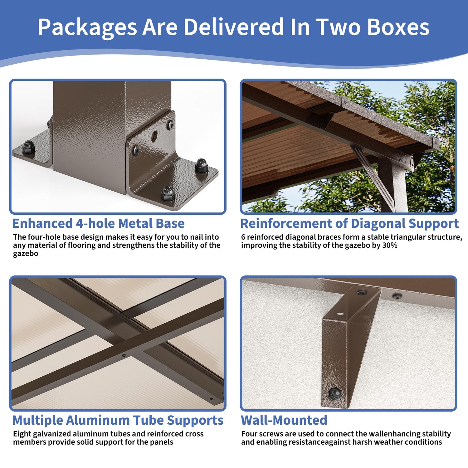 - [Thickened Hardtop Panel] This outdoor gazebo, with 6mm thickened hardtop panels and reinforced aluminum roof tubes, withstands rain, snow, winds up to 40-50 mph, and snow accumulation of 2.4 inches. Its PC panels provide 99% UV protection, retain heat, and let in natural light.
