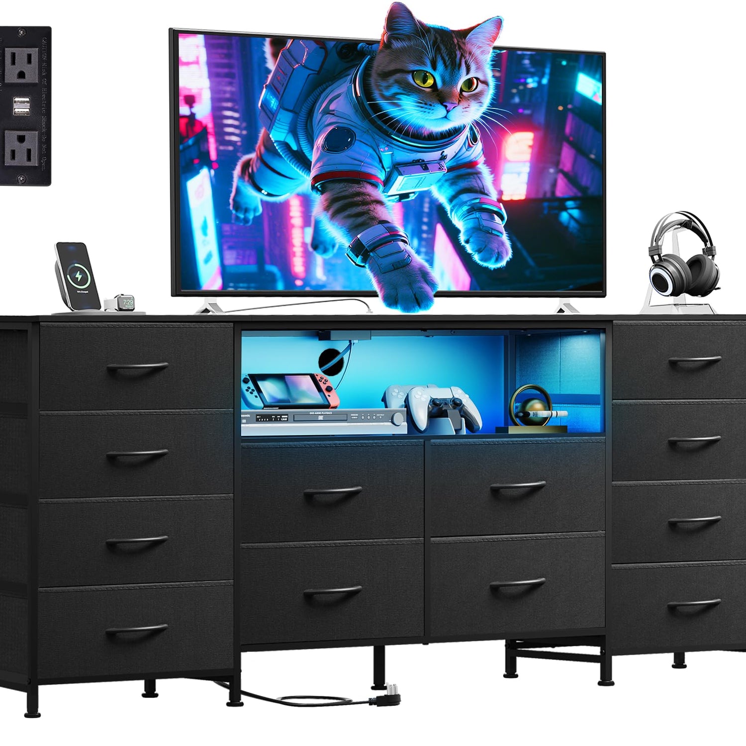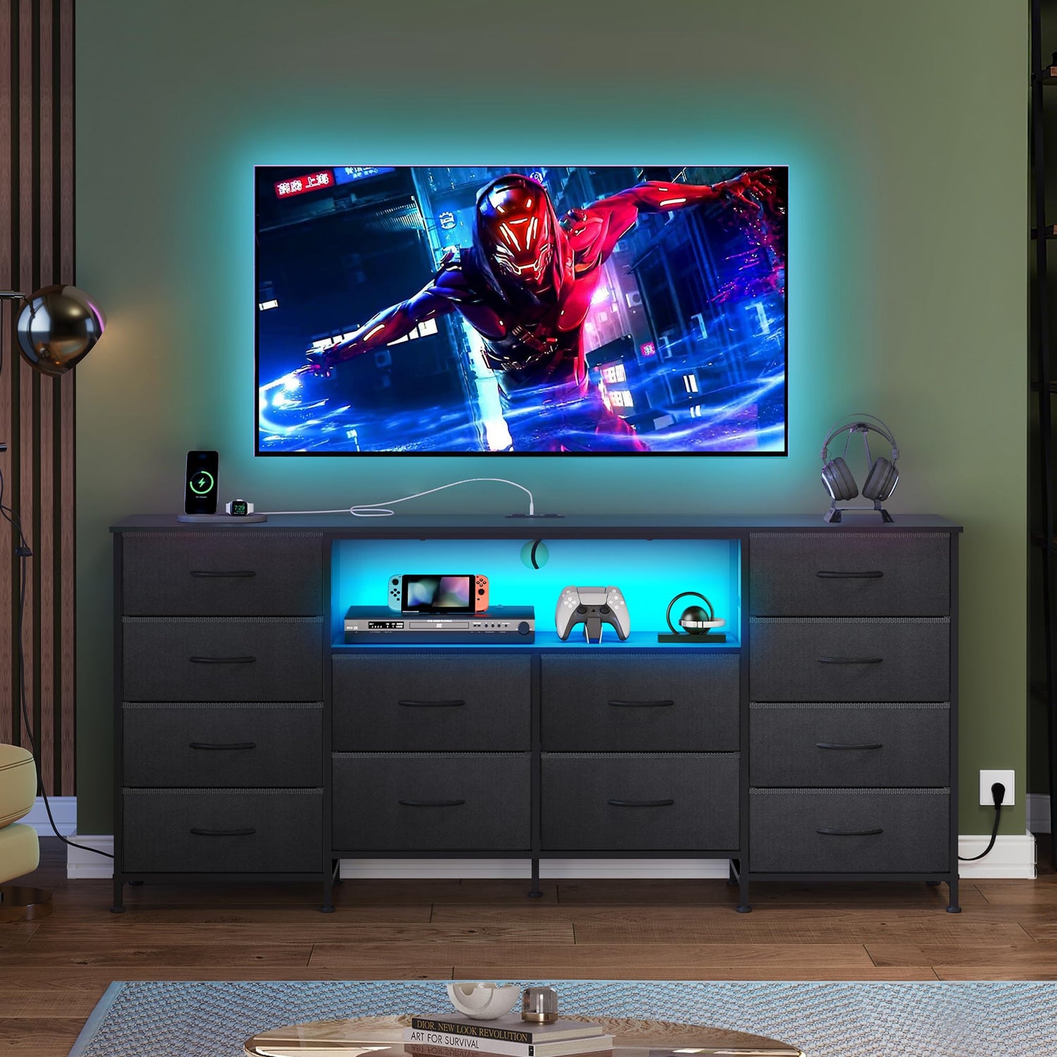 WLIVE 12 Drawer Dresser for Bedroom, Black Dresser TV Stand for 65, 70, 75 inch TV with Led Light & Charging Station, Wide Chest of Drawers with Open Shelves, Fabric Dressers for Closet, Living Room