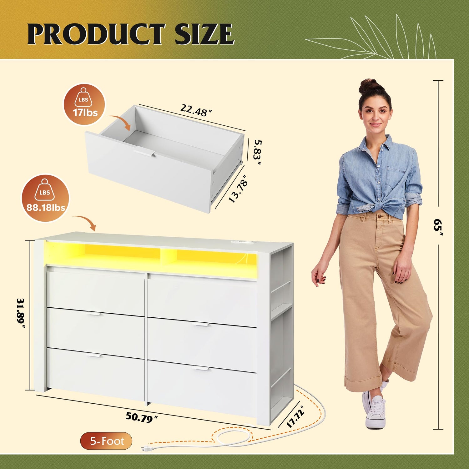 WLIVE 6 Drawer Led Dresser for Bedroom, 50.79'' White Wood Dresser Storage Organizer with Power Outlets for 55'' TV, Dressers with Open Shelves, Hanging Rack, Chest of Drawers for Closet, Living Room