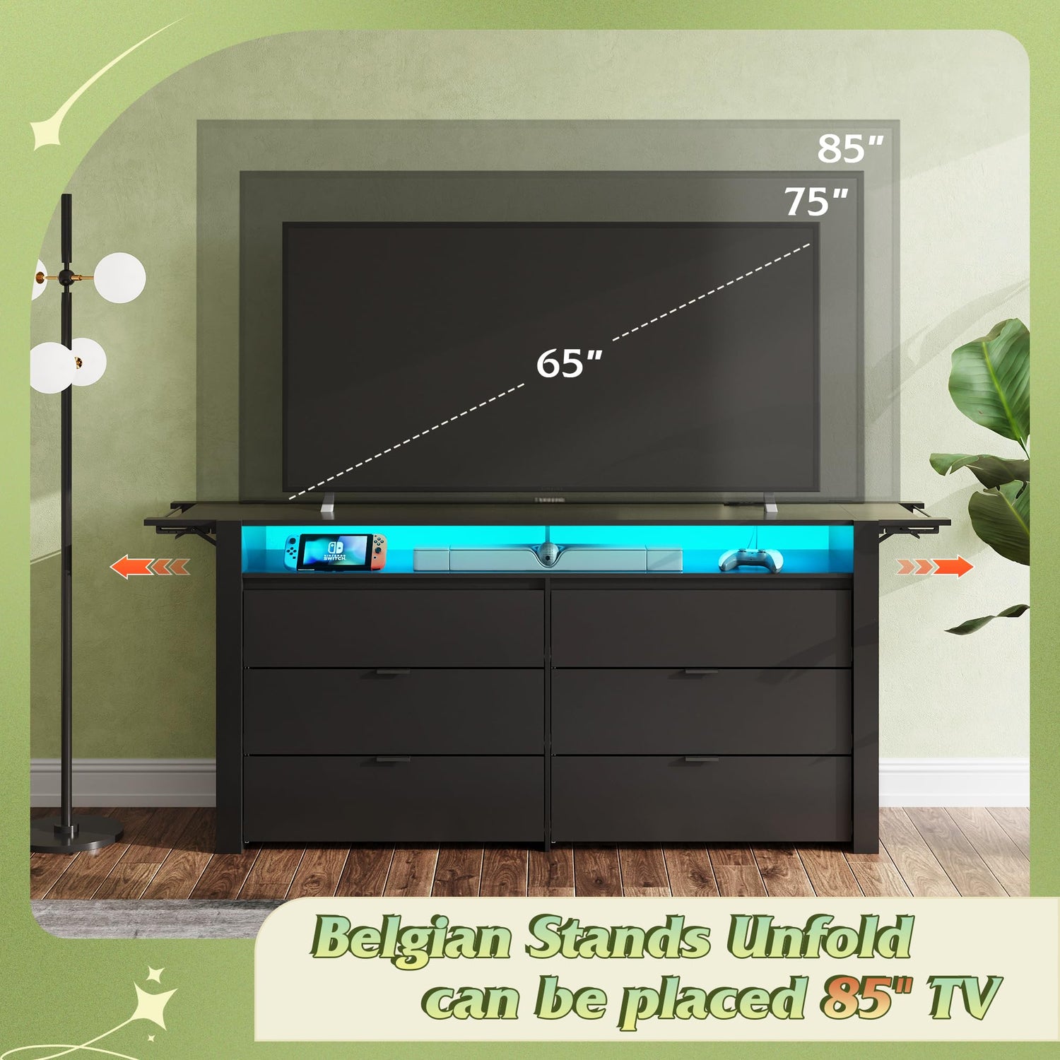 - 【🏠Ample Storage TV Stand】Belgian stands open on both sides can widen the table by 14.25 inches, the overall size of 16.93 "D* 78.03" W*32.17 "H, can be placed 85" TV! Equipped with open shelf + side metal hanger +6 large drawers, the countertop and vertical space utilization rate is 70% higher than the traditional TV cabinet, classification storage and art display!