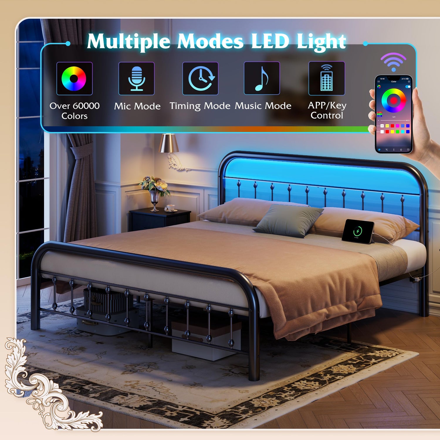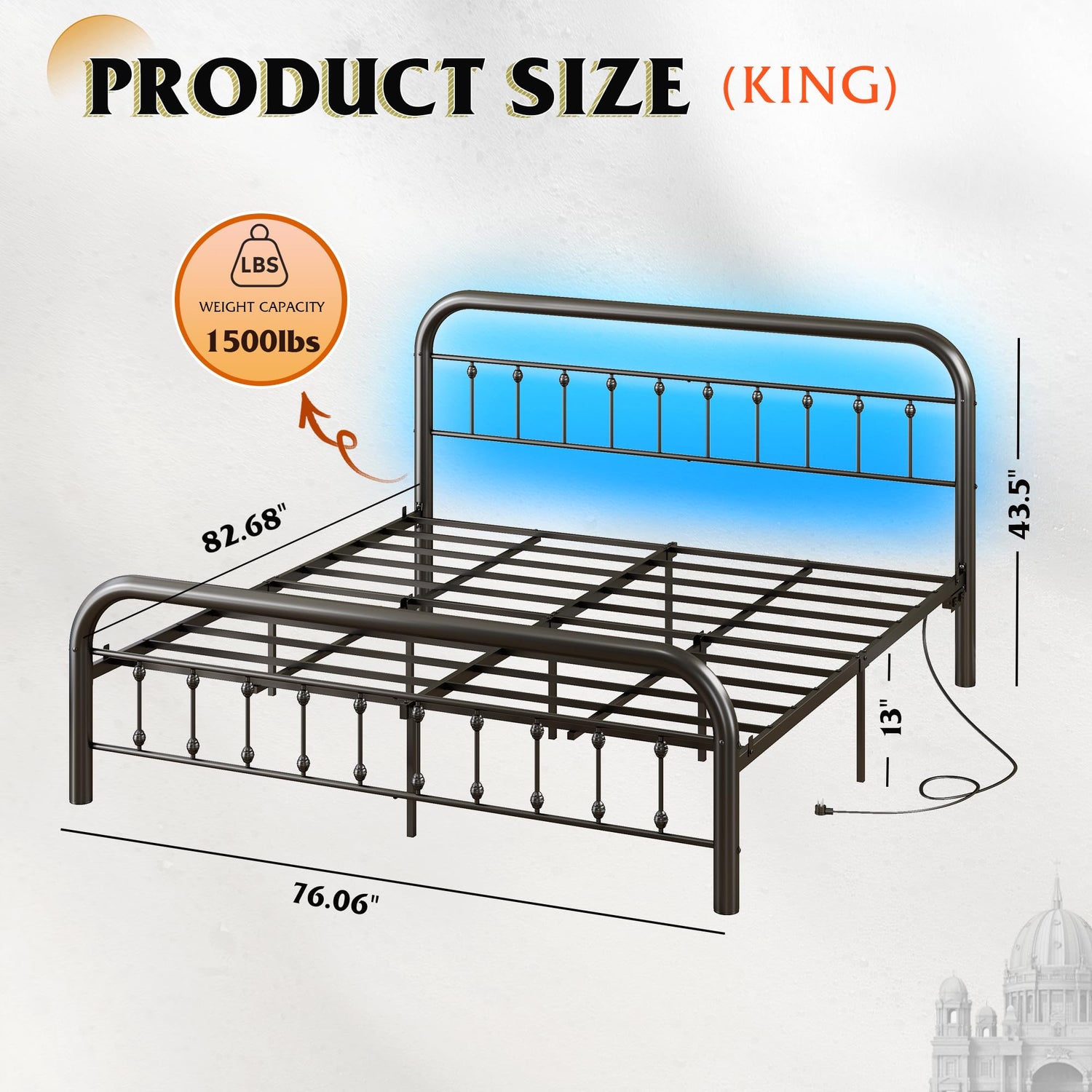 WLIVE Bed Frame King Size, King Size Bed Frame and Headboard, King Bed Frames with LED Lights and Charging Station,No Box Spring Required,Easy Assembly,Black