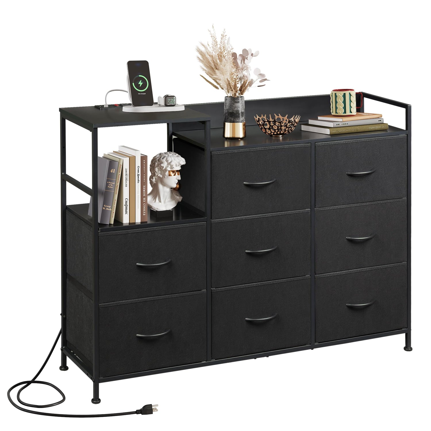 WLIVE Black Dresser TV Stand for Bedroom with Charging Station and Open Shelves, Fabric Dresser with 8 Drawers and Wood Top, Wide Storage Chest of Drawers for Living Room, Hallway