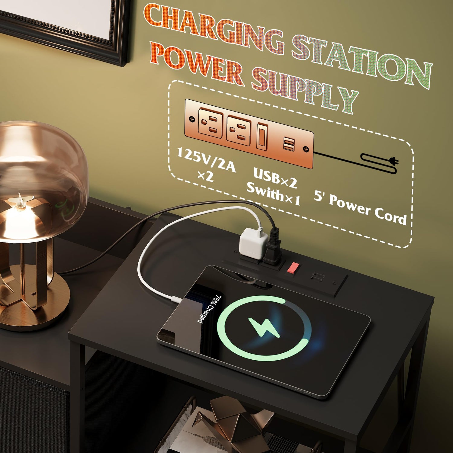 - Built-in Charging Station: This TV console is equipped with a built-in power strip featuring 2 AC outlets, 1 USB port and a master switch for convenient charging of various devices such as your TV, sound system, WiFi, and more.