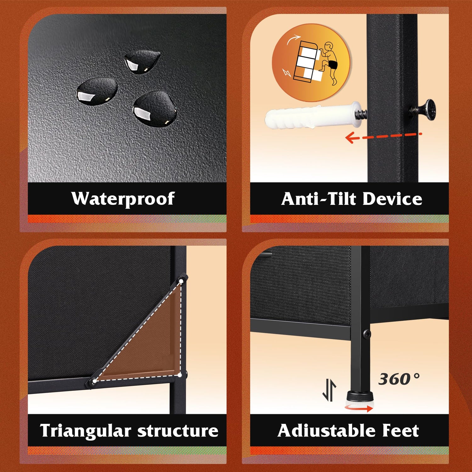 - Family-Safe Design: Non-woven synthetic fabric is breathable and safe. Adjustable feet protect floor surfaces and provide stability on uneven floors. Anti-tipping accessories are included to prevent accidents, creating a safe home environment.