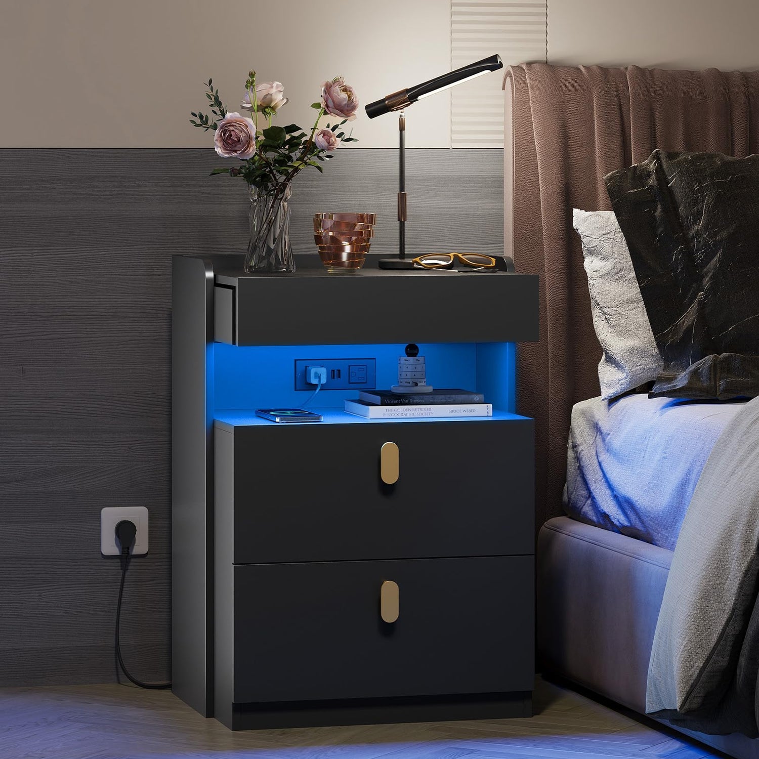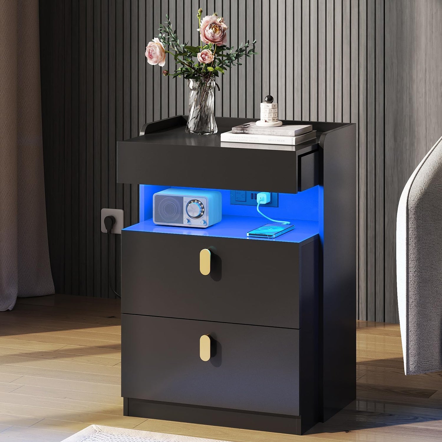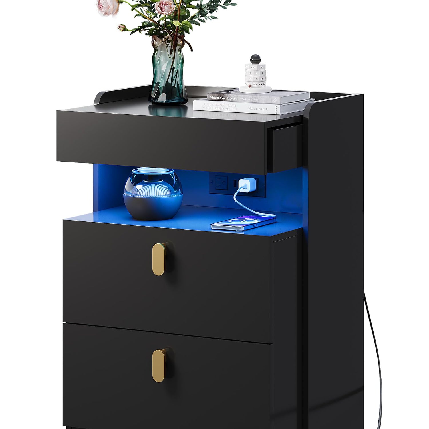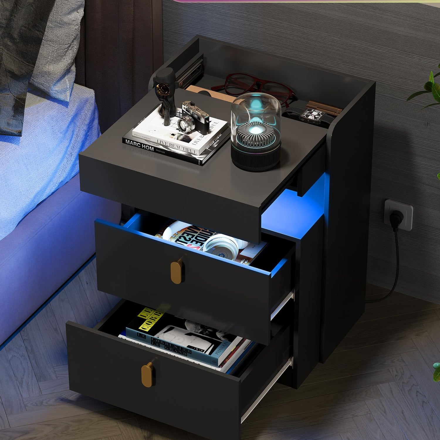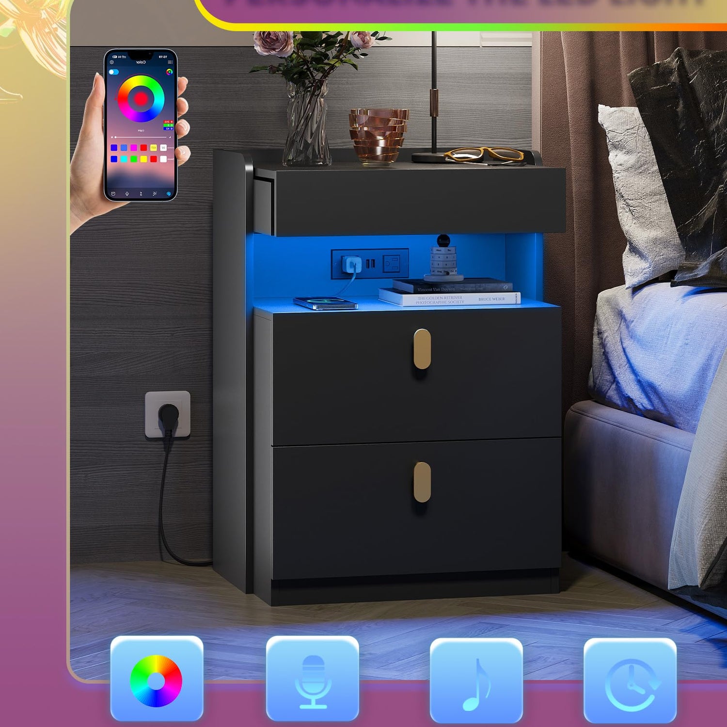 - 【LED Nightstand】This black nightstand features a multi-color light strip controlled via a mobile app. Adjust brightness and colors for a relaxing atmosphere, perfect as a modern bedroom nightstand table.