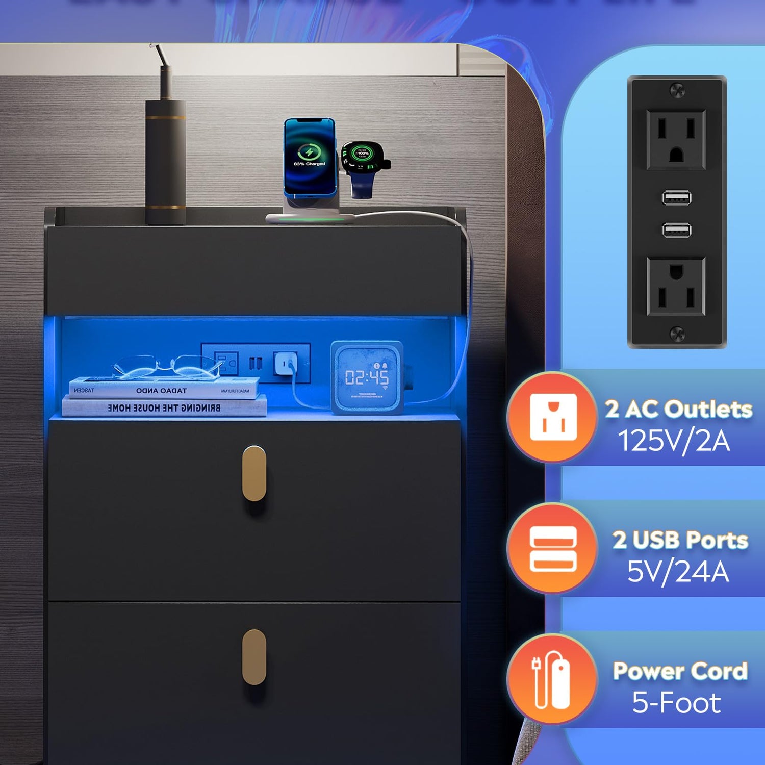 WLIVE Black Nighstand with Charging Station and LED Lights, Night Stand with Sliding Top, Modern Bedside Table with 2 Drawers, End Tables for Bedroom, Living Room, Black