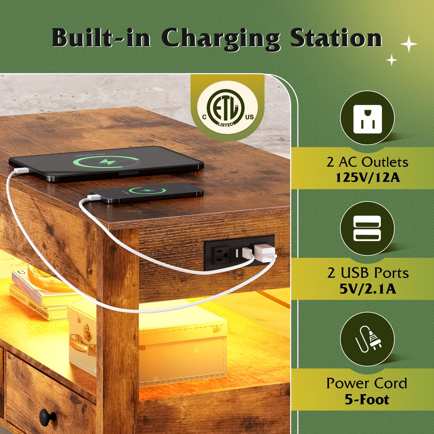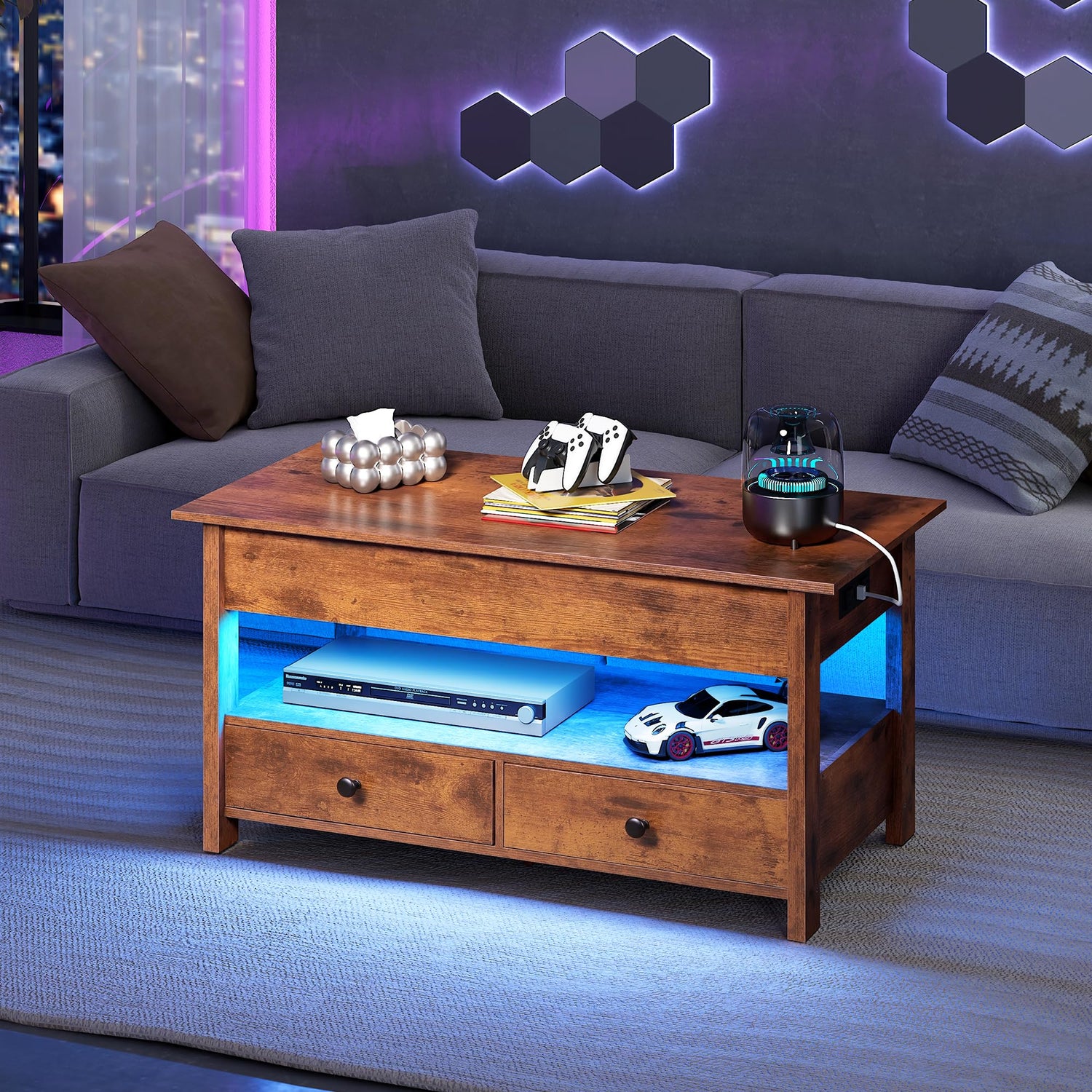 WLIVE Coffee Table, Lift Top Coffee Table with 2 Drawers, LED Light, Large Hidden Compartment and Open Shelf, Lift Tabletop, Dining Table for Living Room, Rustic Brown