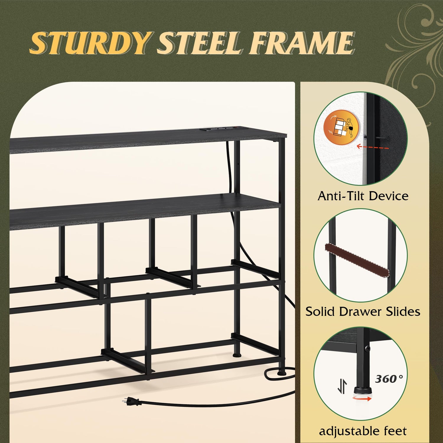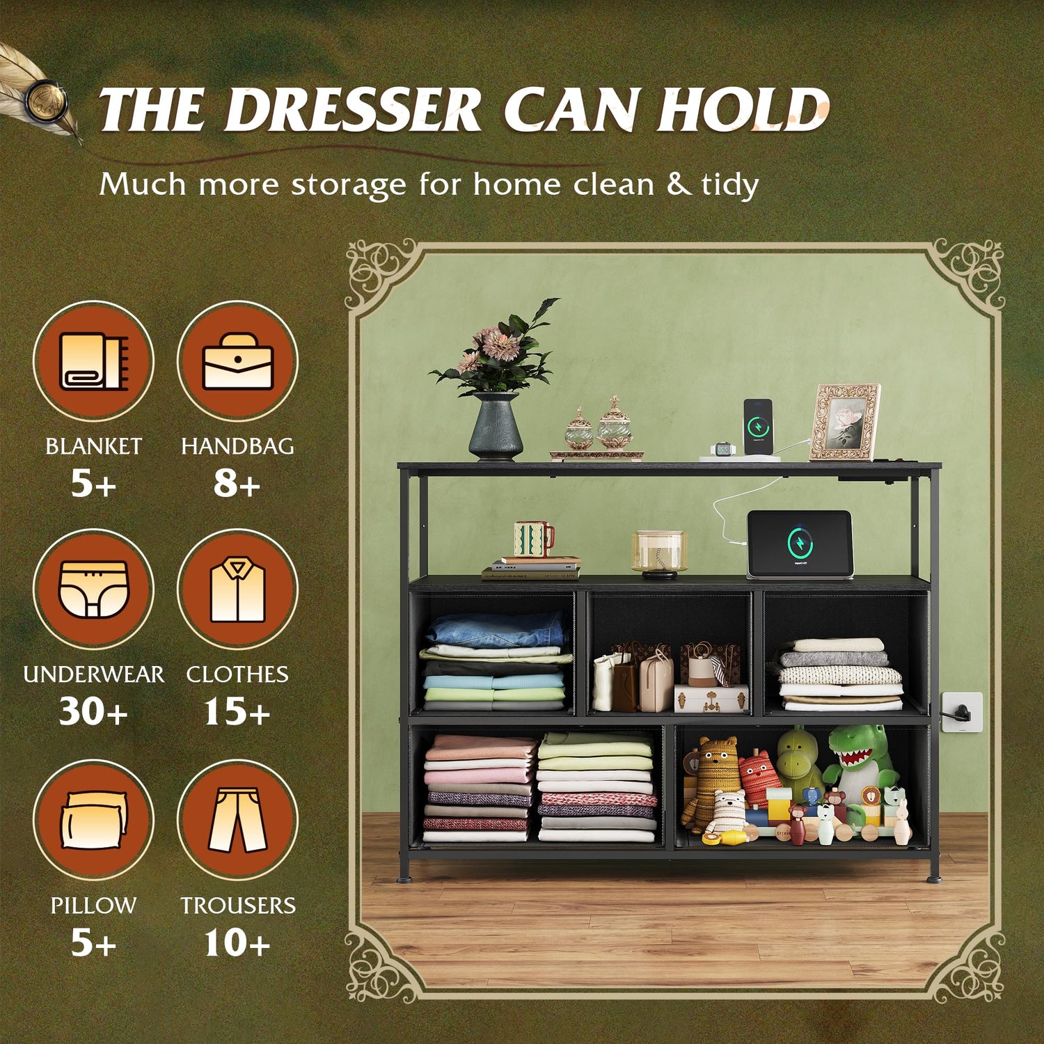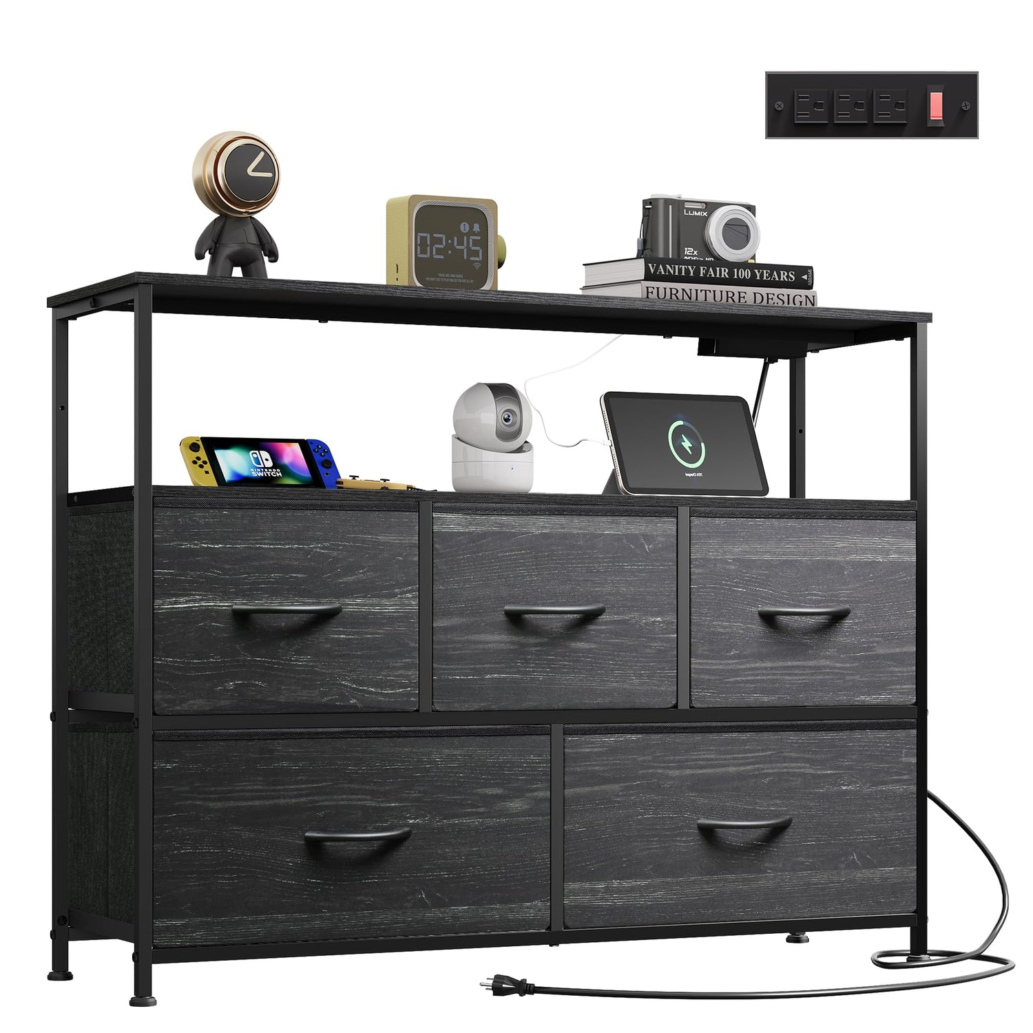 - 【✨ Powered Storage Dresser】Say goodbye to messy wires! The 5 Drawers Dresser is equipped with 3 AC sockets, 1.5m flexible cable length, TV, game console, router a power board can be done, instant increase desktop cleanliness by 50%, through UL/ETL certification, electricity safety!