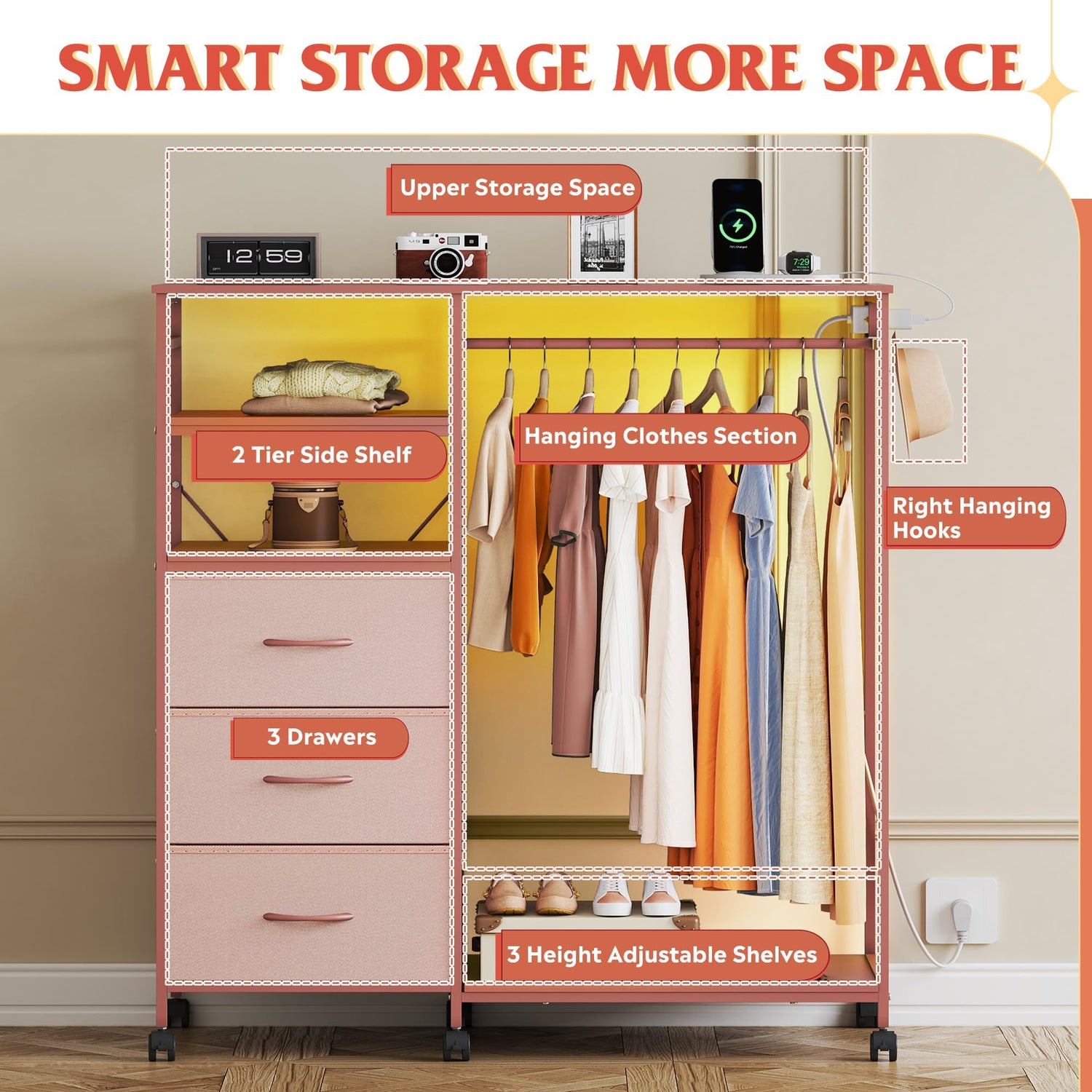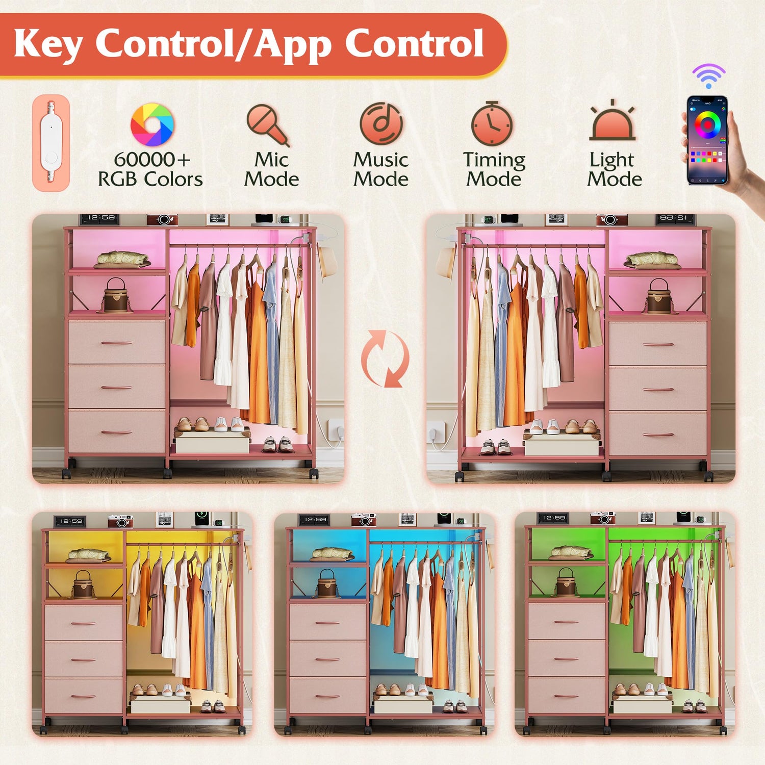 WLIVE Dresser for Bedroom with Clothes Rack, 3 Drawer Dresser with LED Lights & Charging Station, Fabric Dressers & Chest of Drawers, Storage Organizer with Open Shelves for Closet, Living Room, Pink