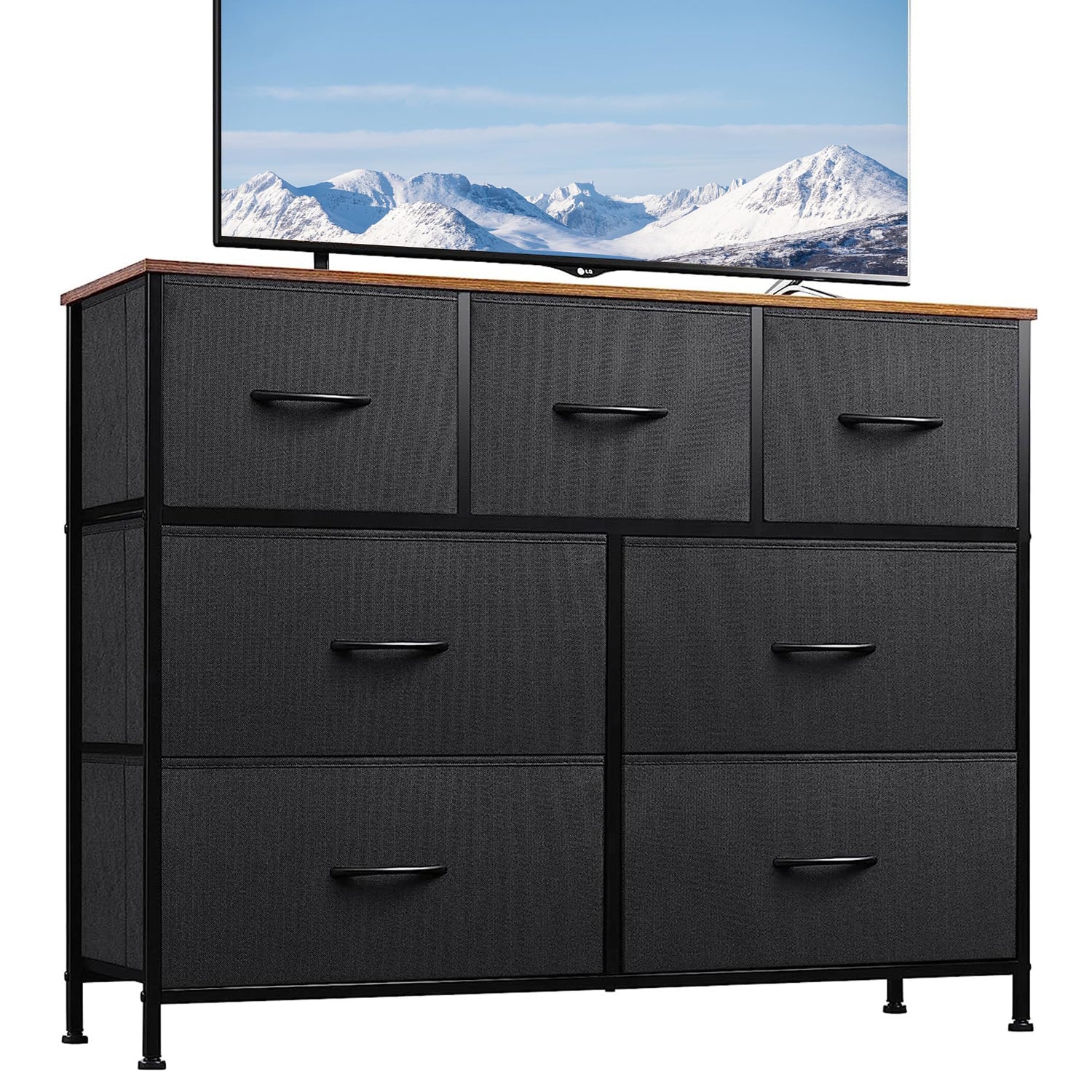 WLIVE Dresser TV Stand, Entertainment Center with Fabric Drawers, Media Console Table with Metal Frame and Wood Top for TV up to 45 inch, Chest of Drawers for Bedroom, Black and Rustic Brown
