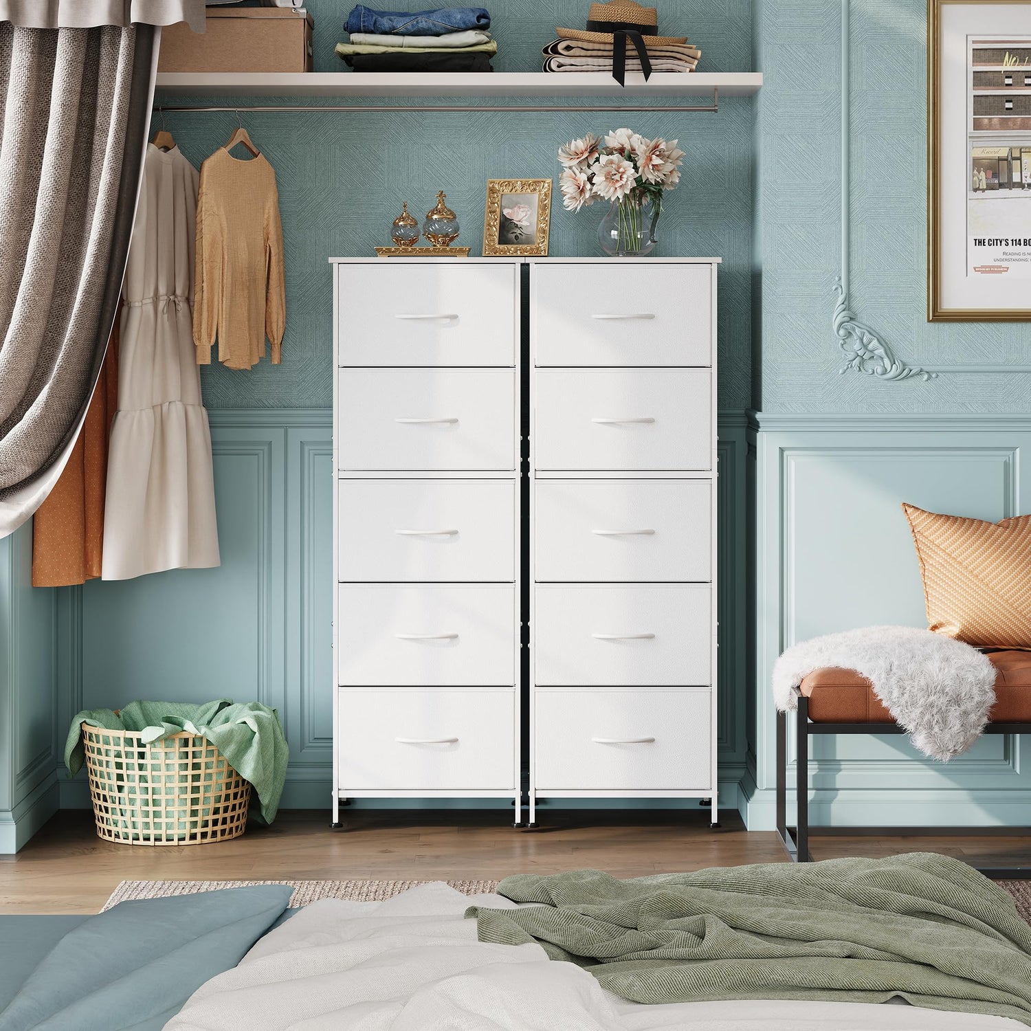 WLIVE Fabric Dresser, 5-Drawer Tall Dresser for Bedroom, Storage Dresser Organizer with Fabric Bins, Wood Top, Sturdy Steel Frame, Chest of Drawers for Closet, Hallway, White