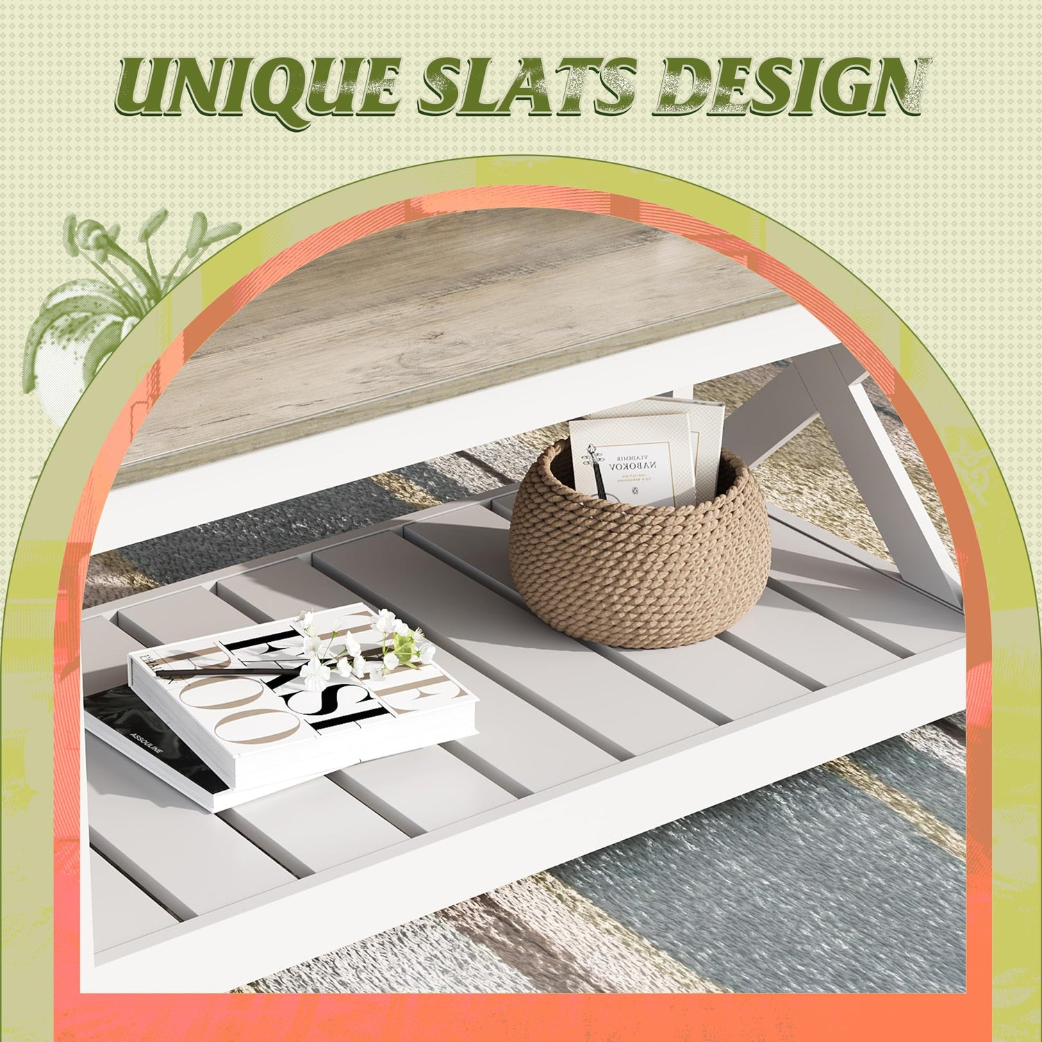 - 【Spacious 2-Tier Storage Space】The wide white coffee table top and slatted bottom shelf provide ample space for decor, books, snacks, or games—keeping your living area tidy and stylish