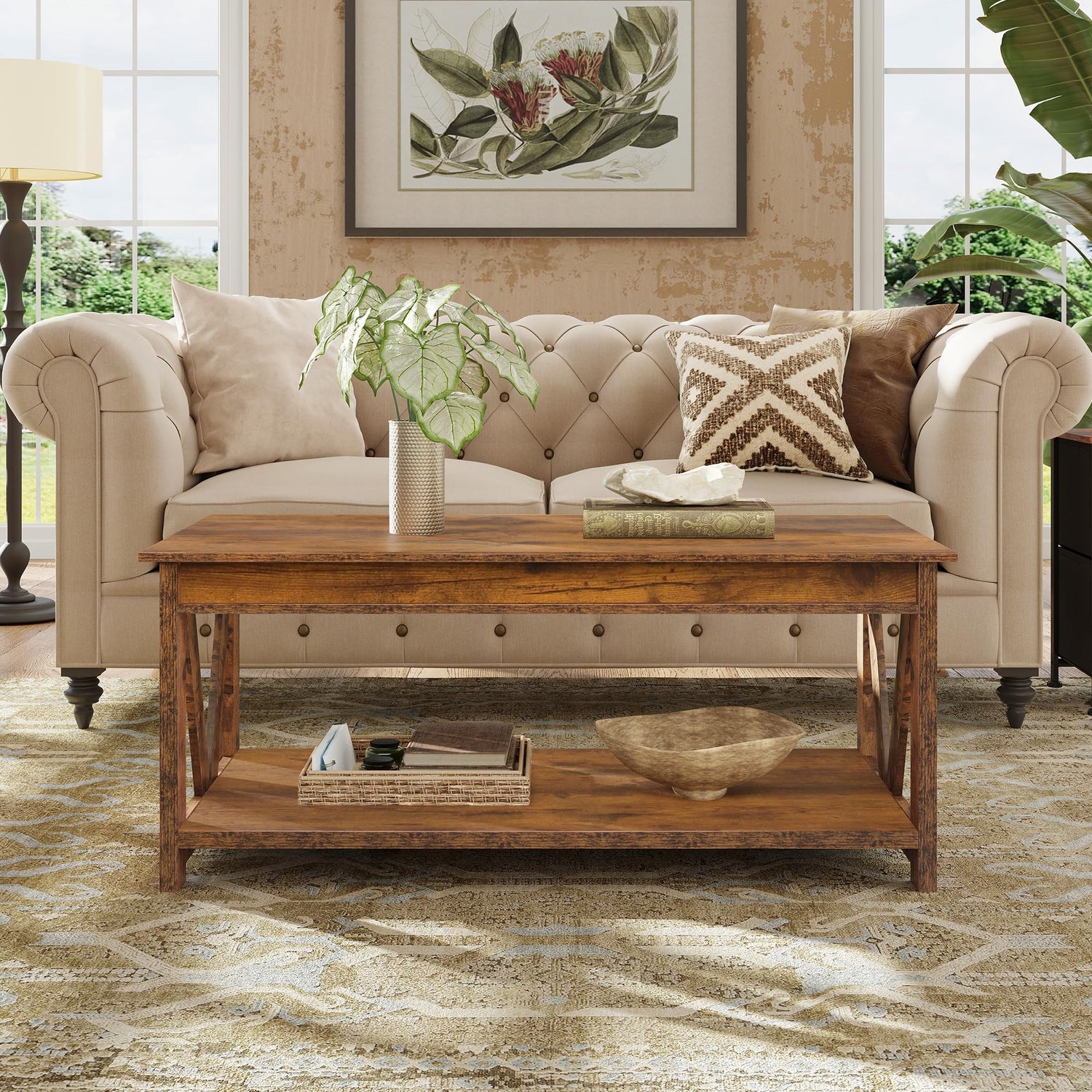 WLIVE Farmhouse Coffee Table,Living Room Table with Storage,43 in Wood Center Table with V-Shaped Frame for Home Office,Apartment,Rustic Brown