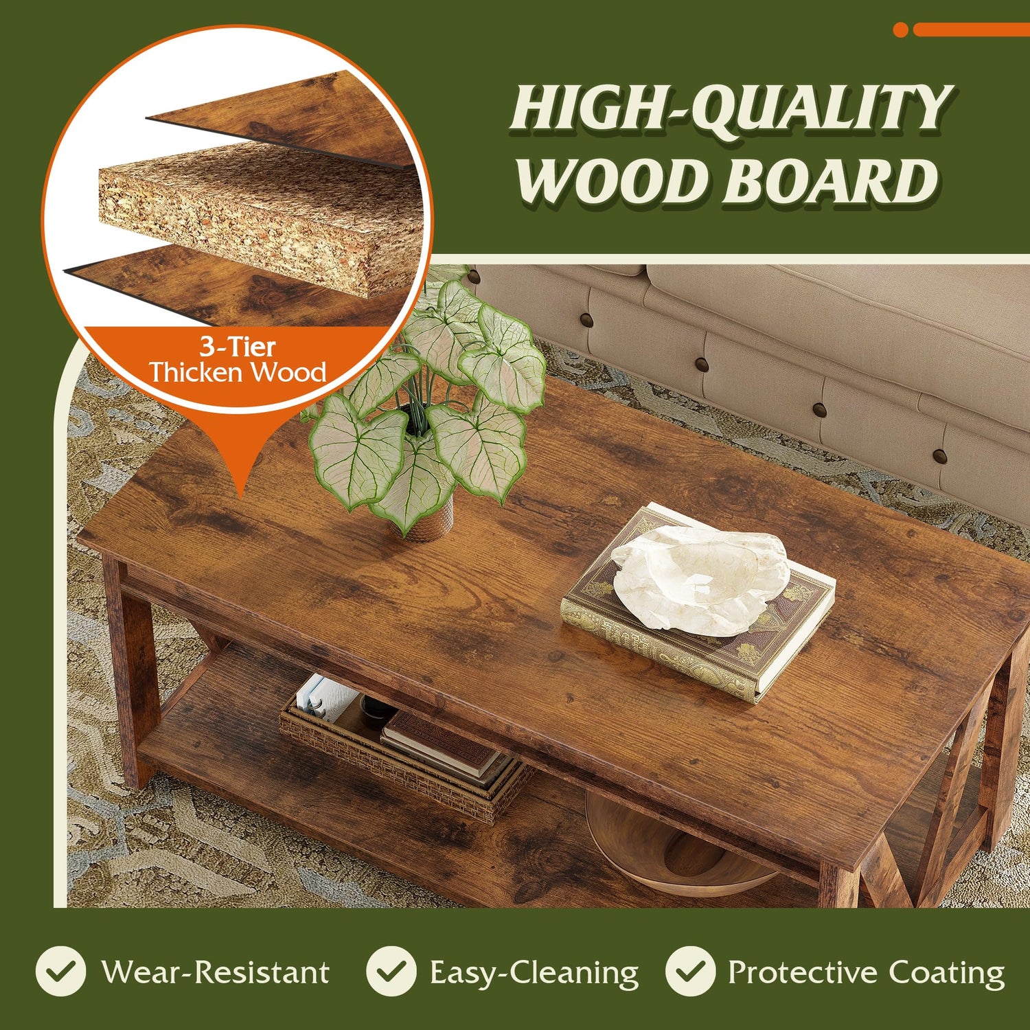 - 【Storage Space Master】The wood coffee table has 2-tier open shelf for living room items such as cups, books, tissues,toys and a variety of items.The 43inch desktop has enough space to keep your items handy and organized.