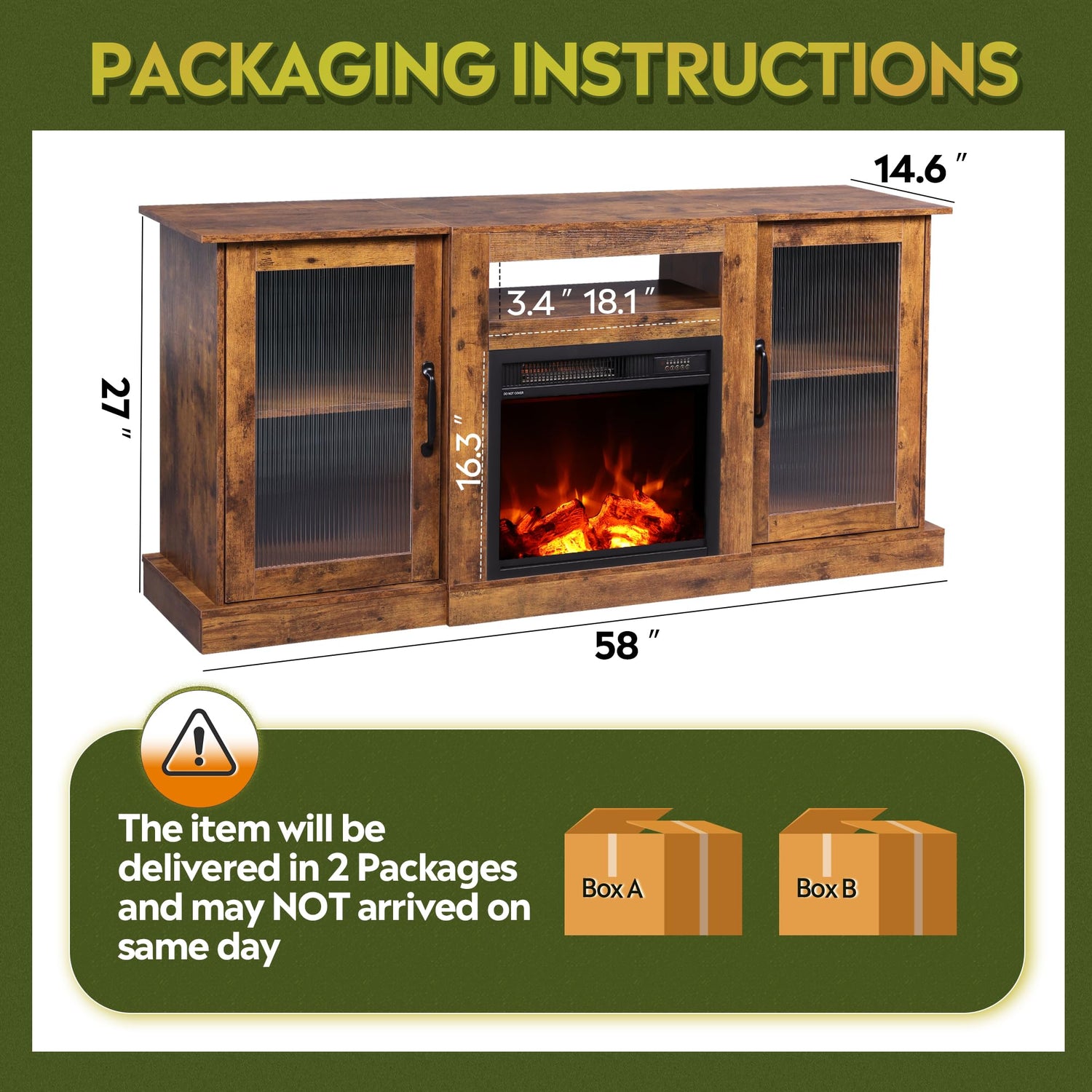 - 【Fireplace TV Stand with Heater】This 58 "W x 14.6 "D x 27 "H TV stand has a 18-inch built-in electric fireplace heater with 2-level heating adjustment, which has a great heating ytem kick off a lot of heat, setting a vibe of warm and stylish in the living room.The Media Center equipped with an auto shut-off timer that can be set for up to 7.5 hours.