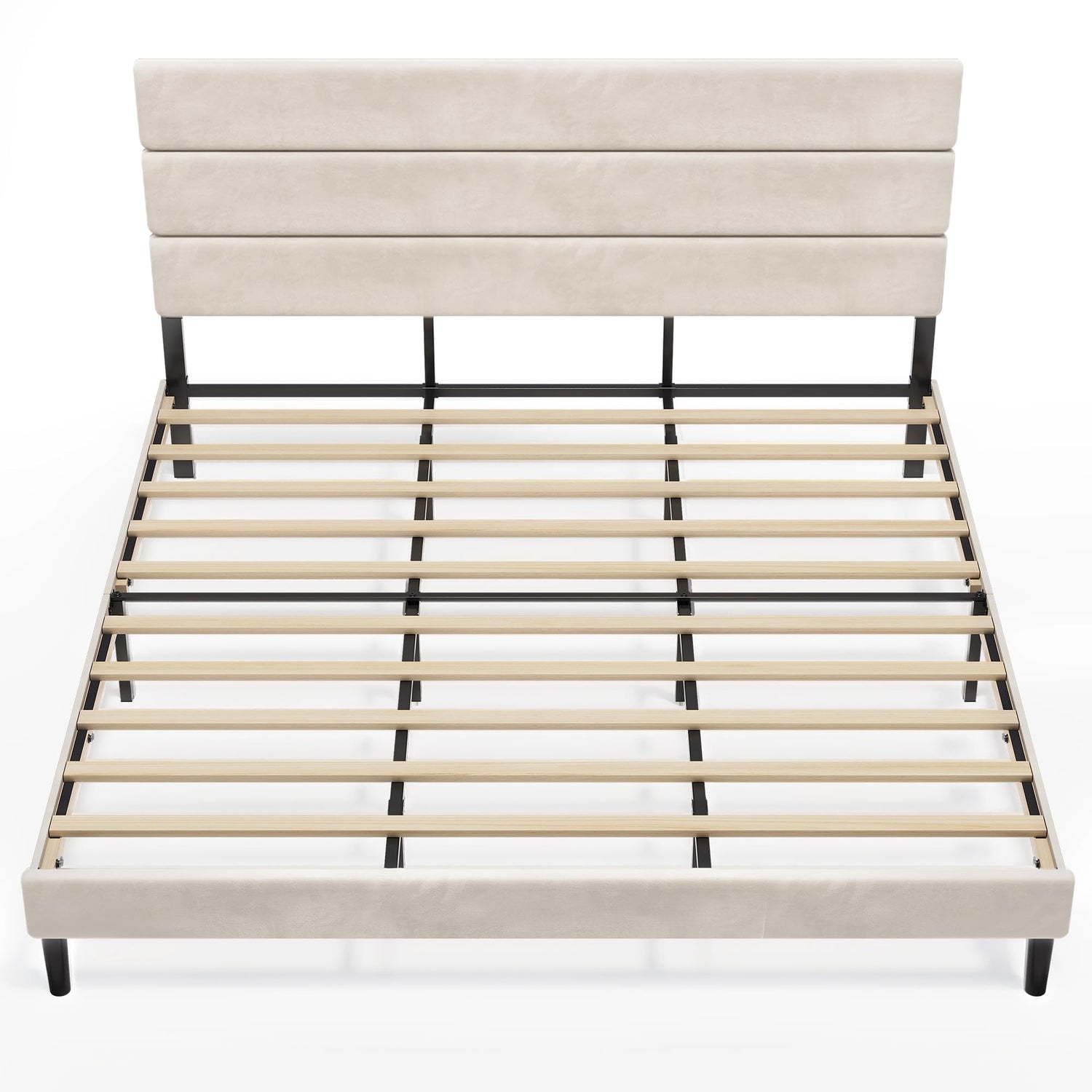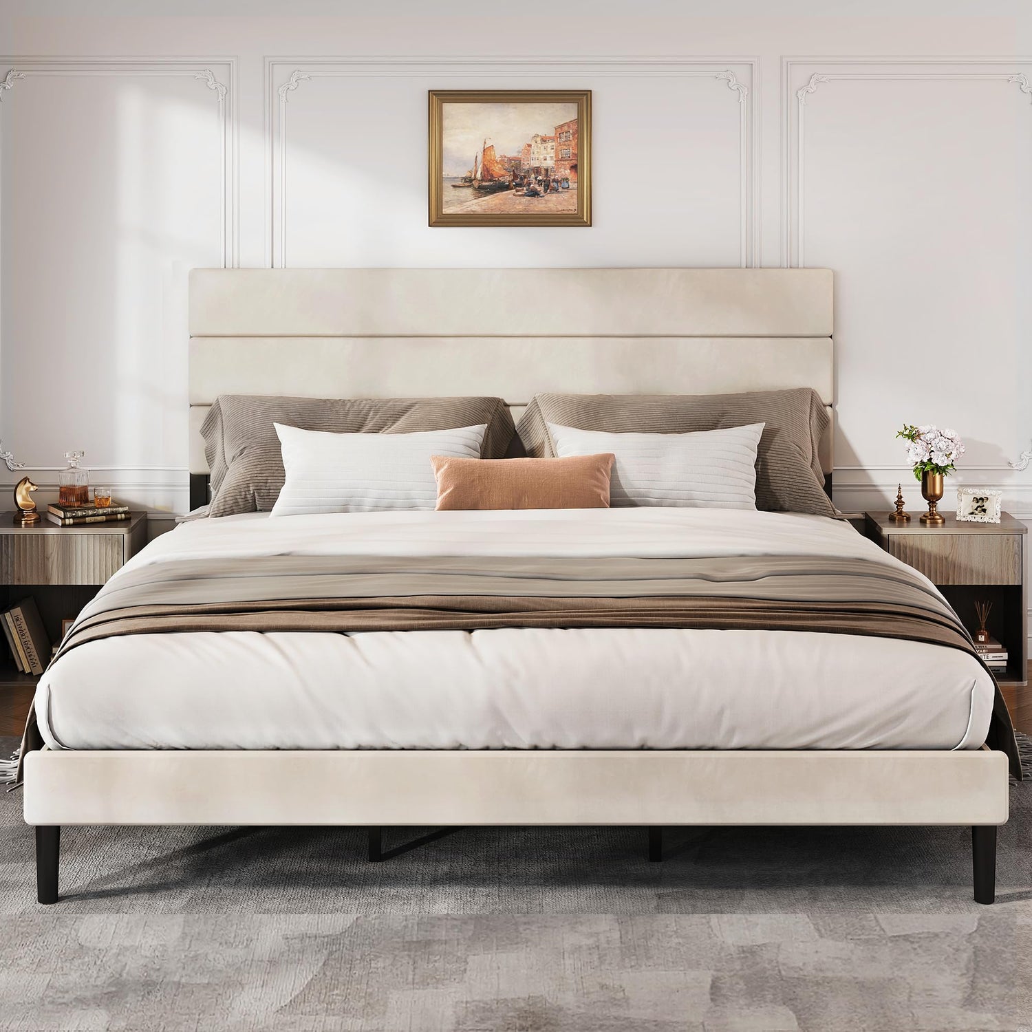 WLIVE King Size Upholstered Bed Frame, Velvet Square Tufted Headboard, Sturdy Metal & Wooden Slats Support, No Box Spring Needed, Beige