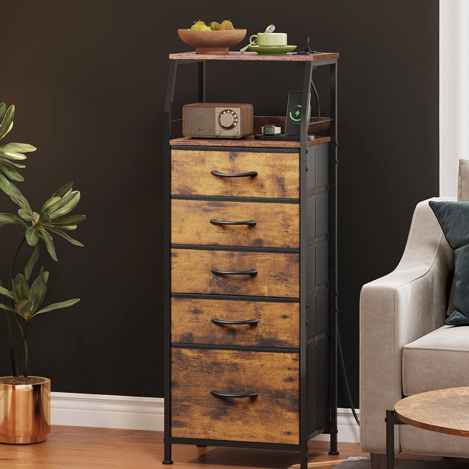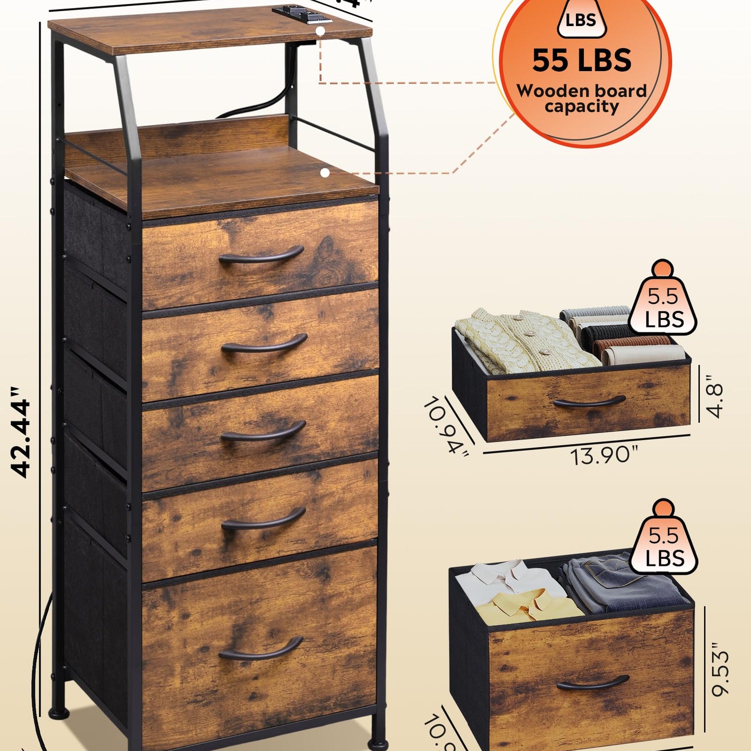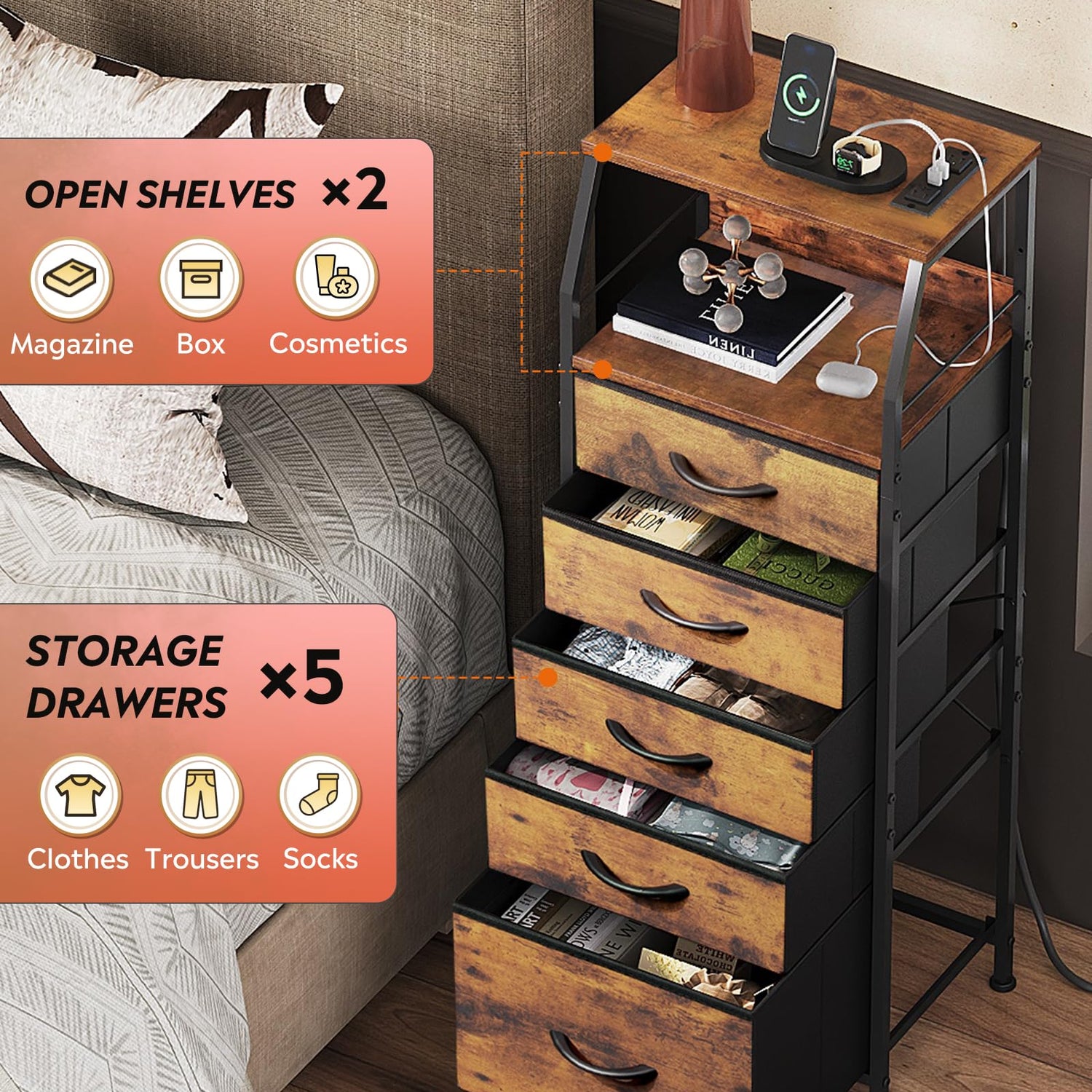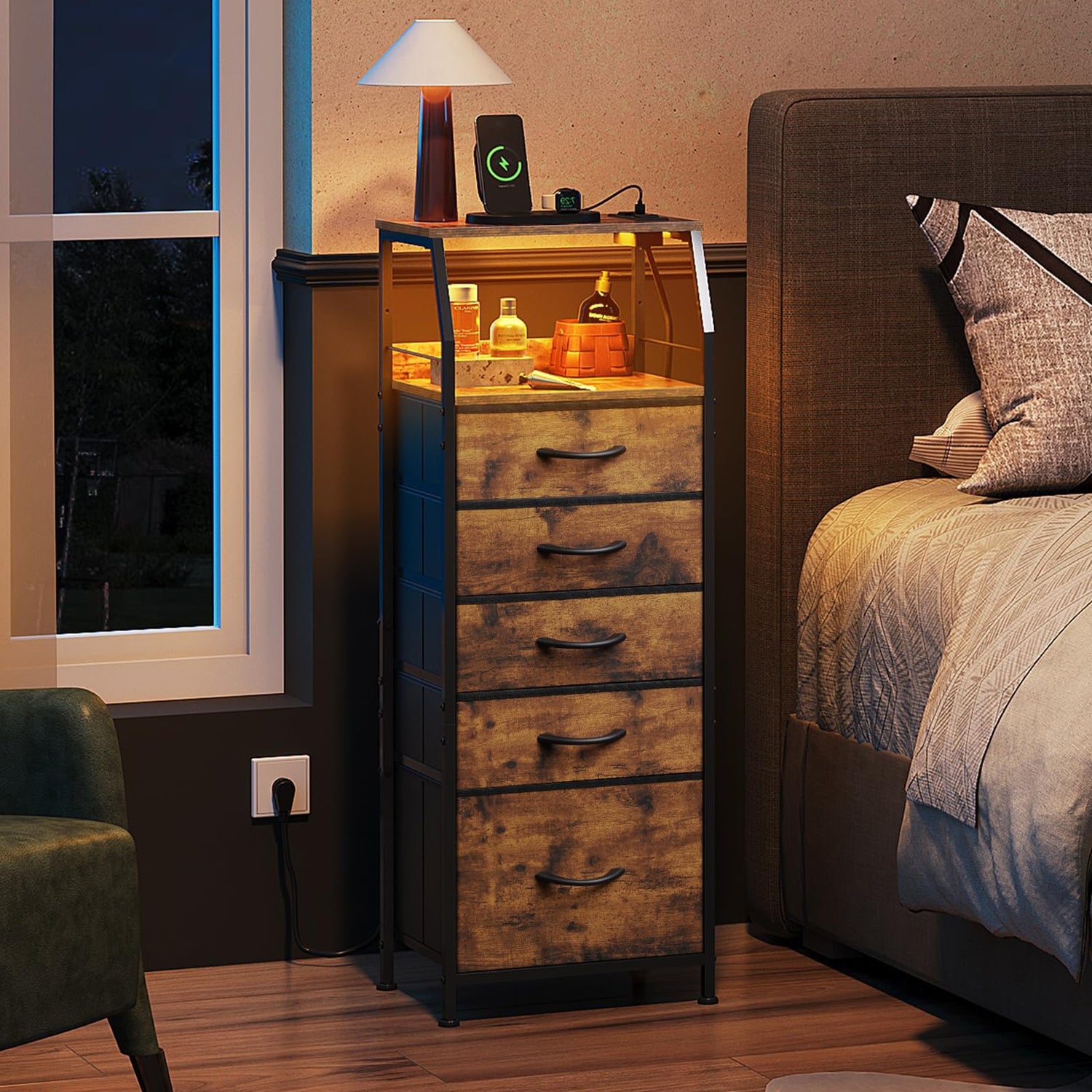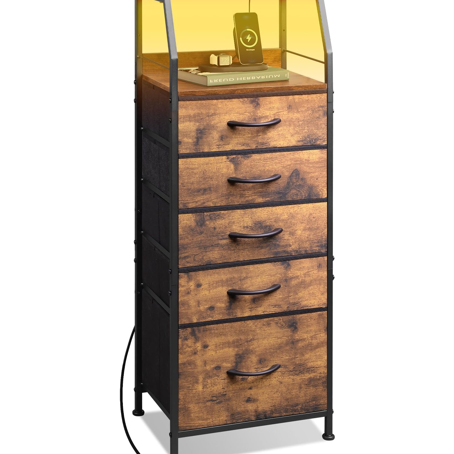 WLIVE LED Nightstand with Charging Station, Fabric Dresser with 5 Drawers for Bedroom, Tall Night Stand with Open Shelves, Bed Side Tables Living Room, Rustic Brown
