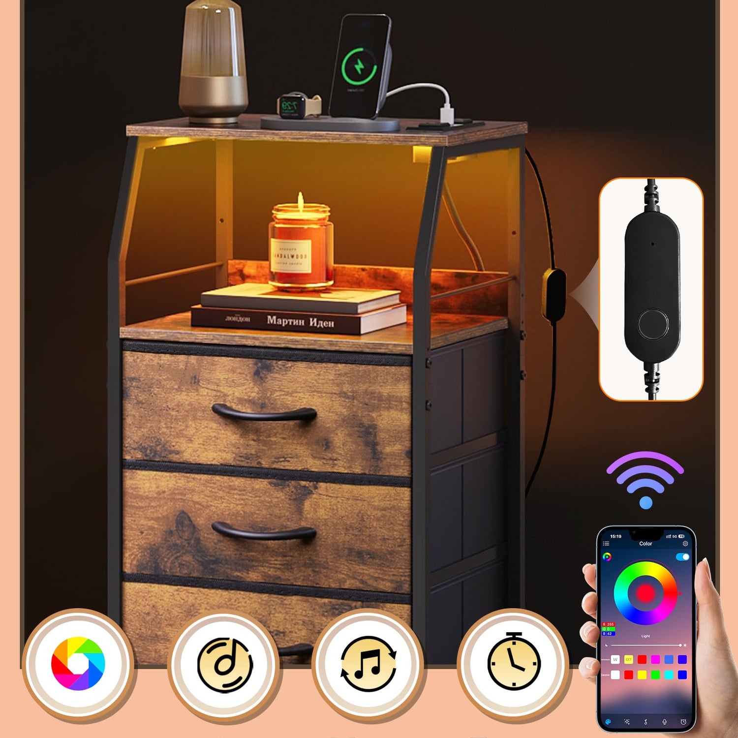 - [Customizable LED] This bedroom nightstand features a vibrant LED light strip, adjustable via a mobile app. Control brightness, colors, and enjoy soothing music for a relaxing sleep environment.