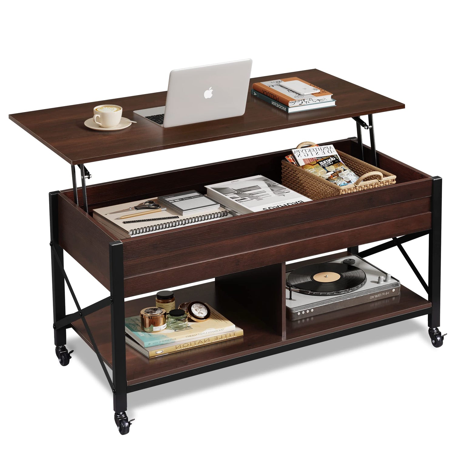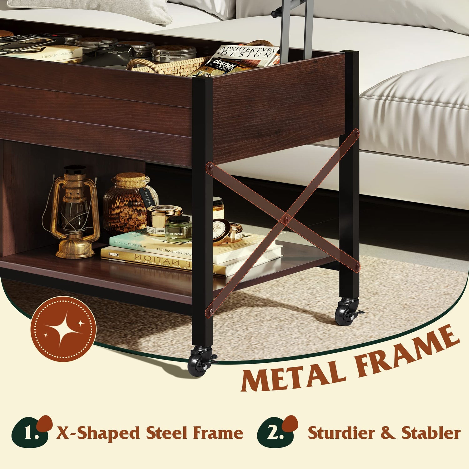 WLIVE Lift Top Coffee Table for Living Room, Coffee Table with Storage, Hidden Compartment and Metal Frame, Central Table with 4 Casters for Reception Room, Espresso