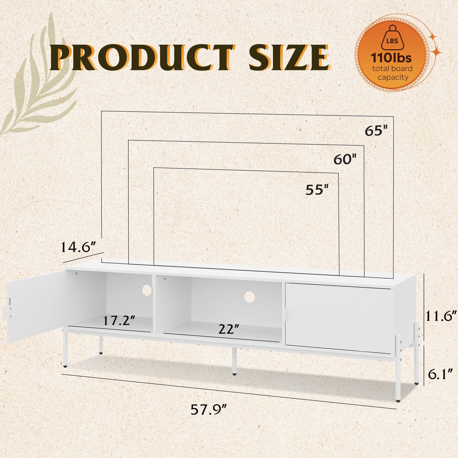 - 【Mid-Century Modern Style】The minimalist cabinet combined with metal legs styling brings mid-century modern charm to your bedroom and living room. The cabinet door with metal pulls for easy opening and closing while adding chic charm to all decorating styles, and can also be paired with other furniture in your home for the perfect look. Demission of the TV stand: 57.9"D x14.6"W x 17.7"H, and suitable for 55/60/65 inch TV.